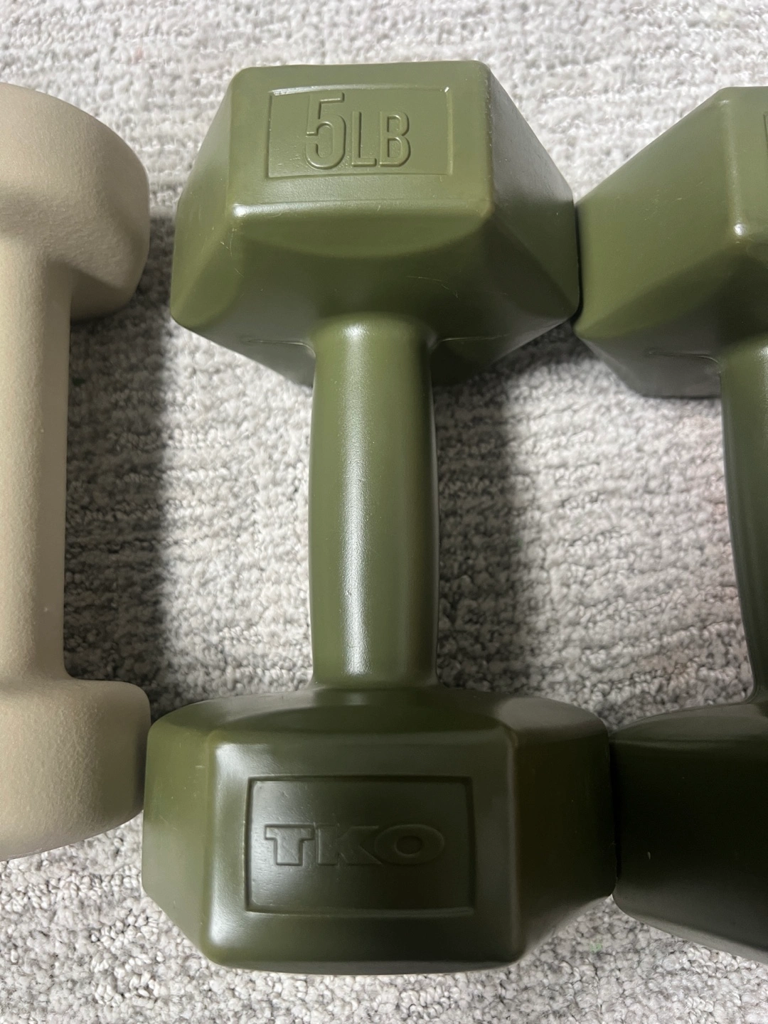 Selling a set of dumbbells! There are two TKO dumbbells at 5lbs each, and one dumbbell at 7lbs. Great for home workouts!