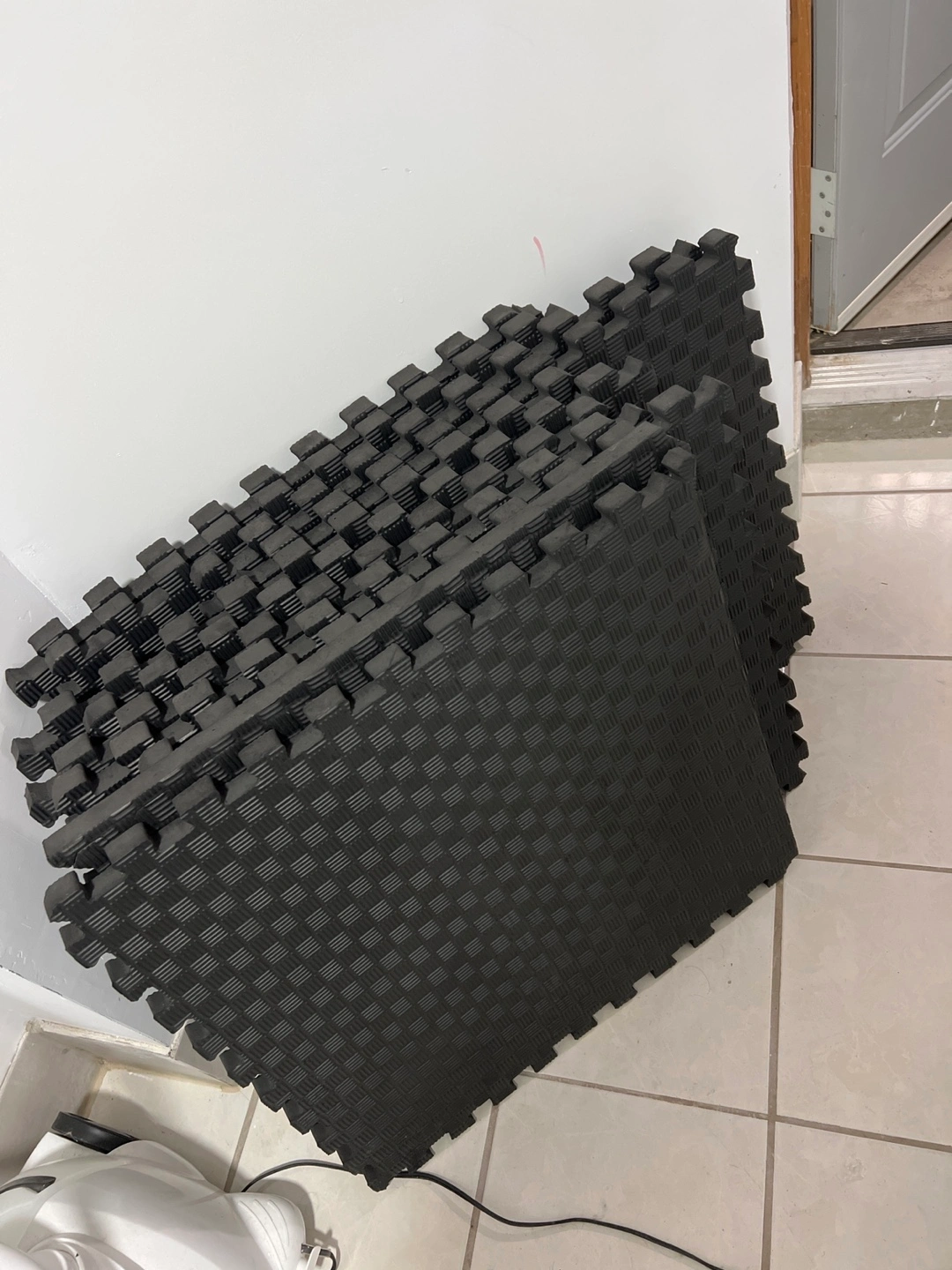 Selling a set of black foam interlocking floor mats. They are in great condition and perfect for creating a cushioned surface in a playroom, gym, or any other space where you need some extra padding