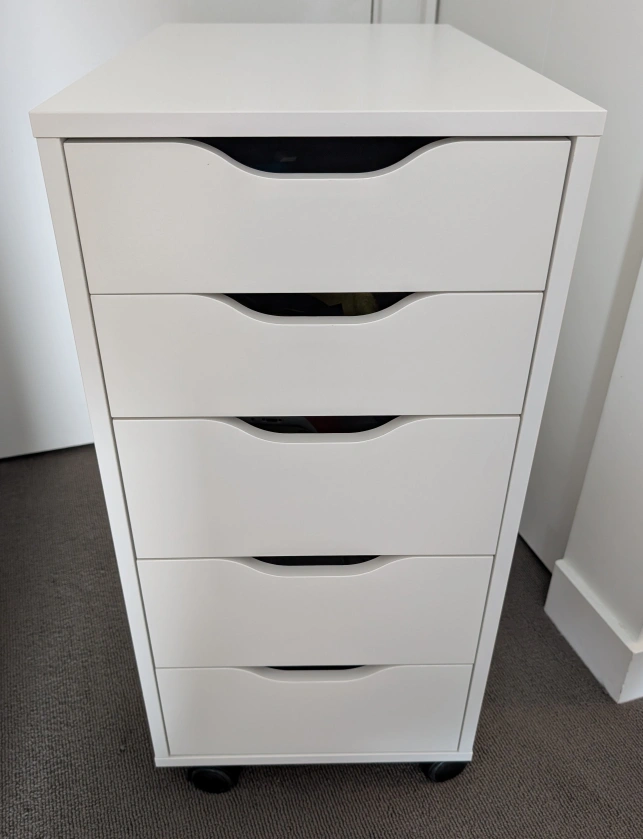 Selling a white IKEA Alex drawer unit with Wheels! It's perfect for organizing your space and adding a clean, modern touch. This unit features five drawers, providing ample storage for all your needs.