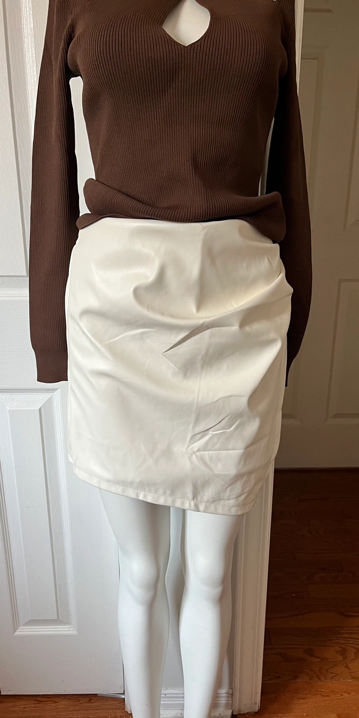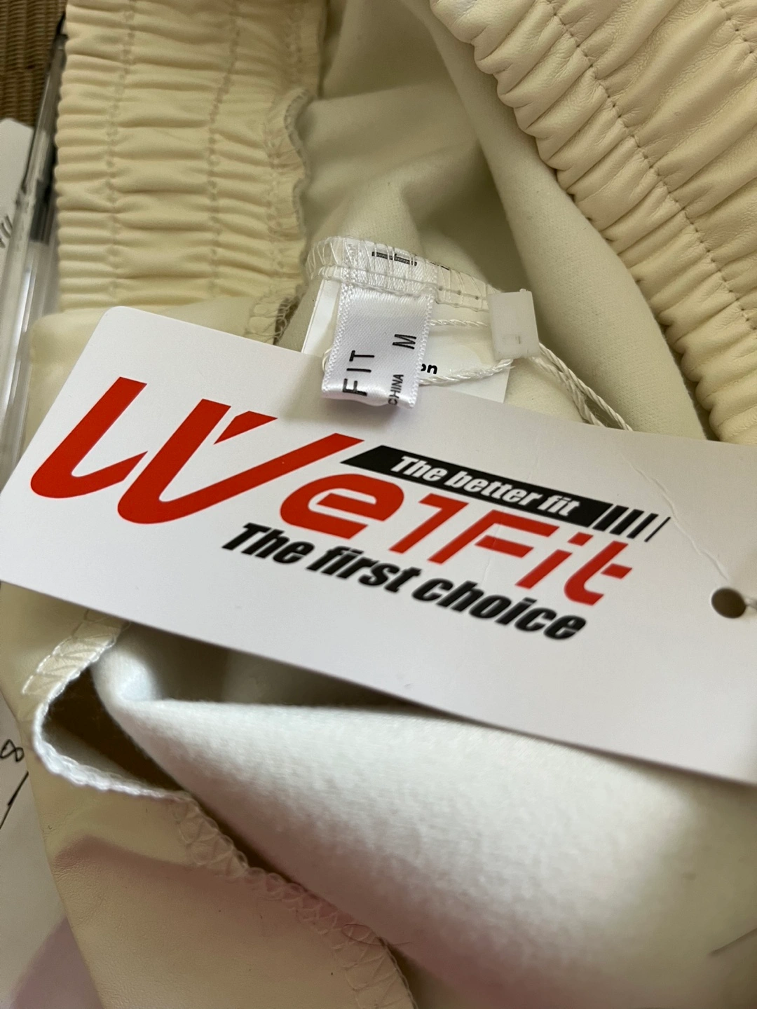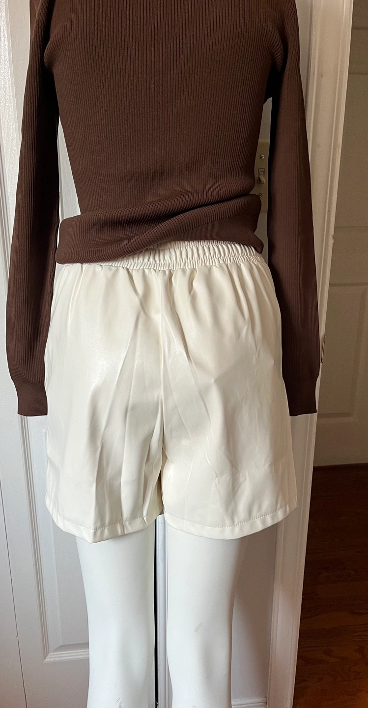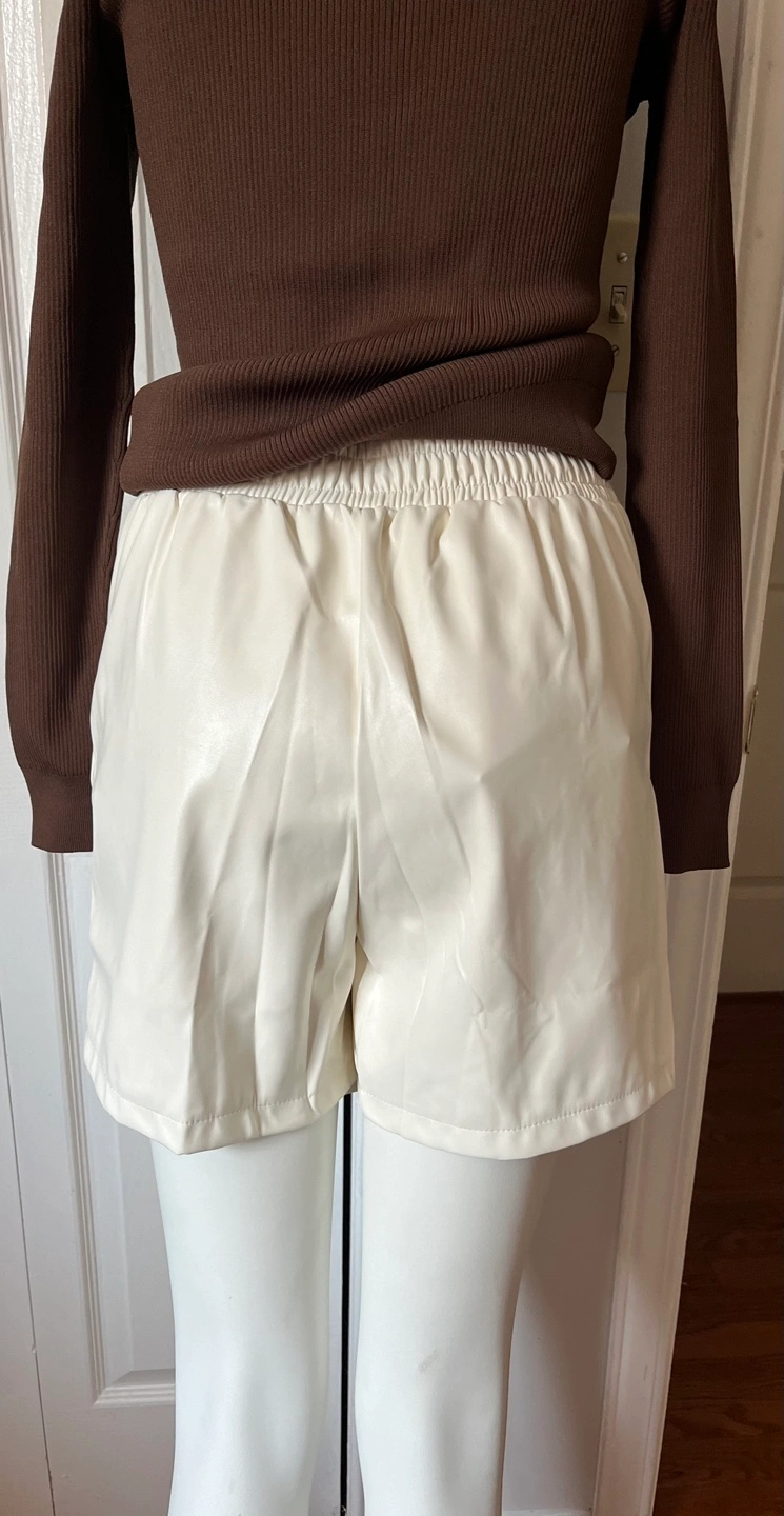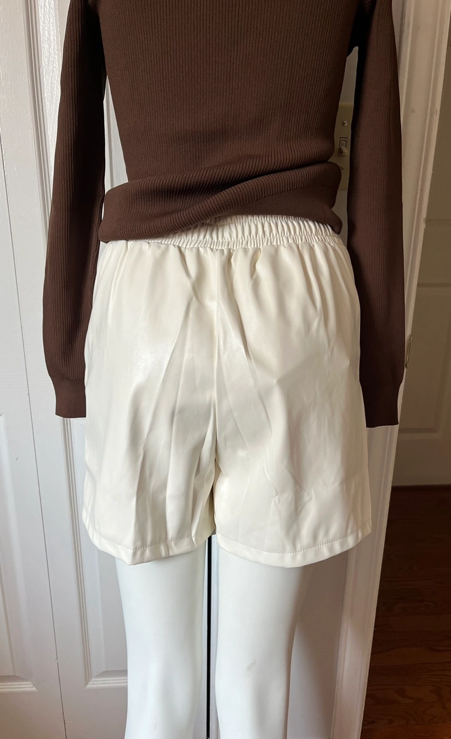 These WeiFit shorts are a stylish addition to any wardrobe! They are made of a cream-coloured faux leather, and they're a size medium. Perfect for a night out or a casual day!