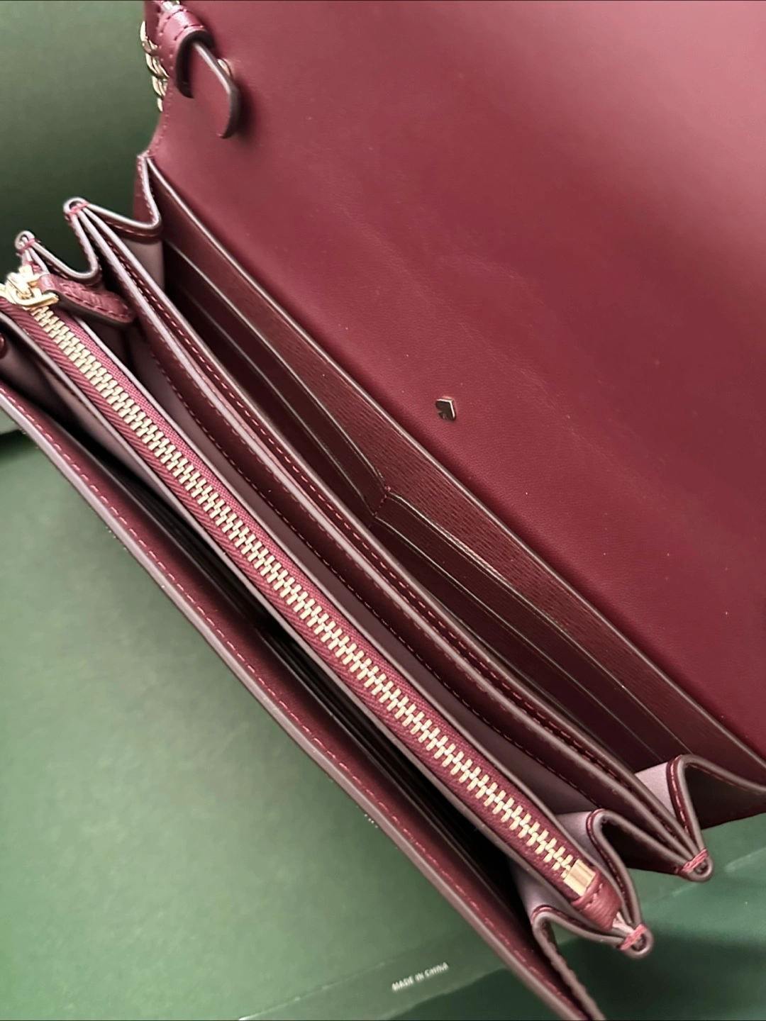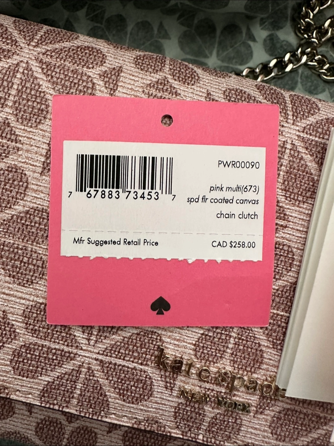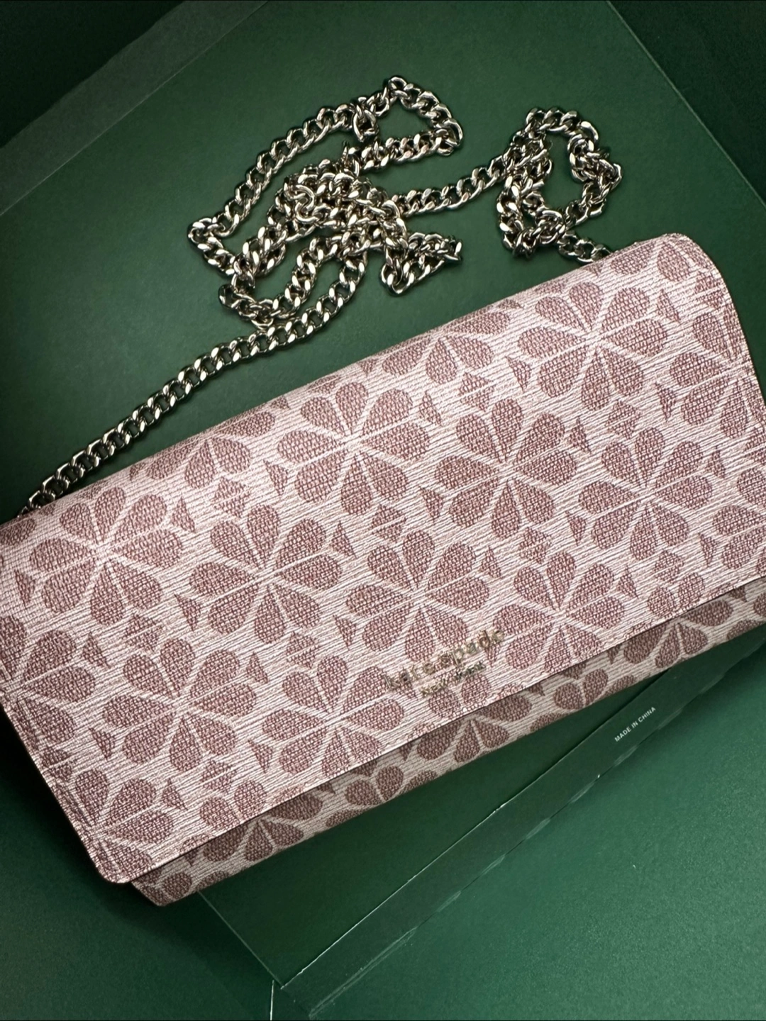 This Kate Spade crossbody wallet is in new condition and comes with its original box! It features a stylish pattern and a chain strap, perfect for keeping your essentials organized while on the go
