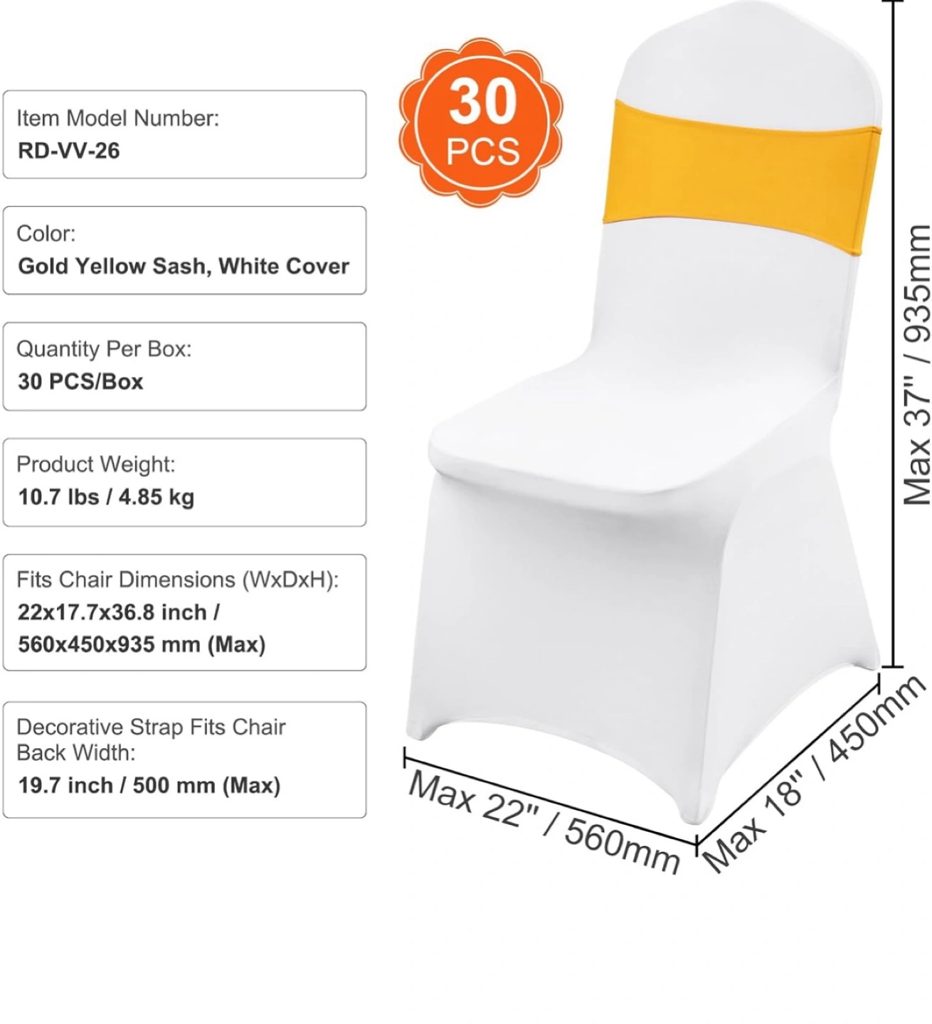 Selling a set of 30 chair covers! They feature a white cover with a gold yellow sash. The sash has a silver chrome-plate round buckle. They're designed to be soft and easy to stretch, resistant to tearing.