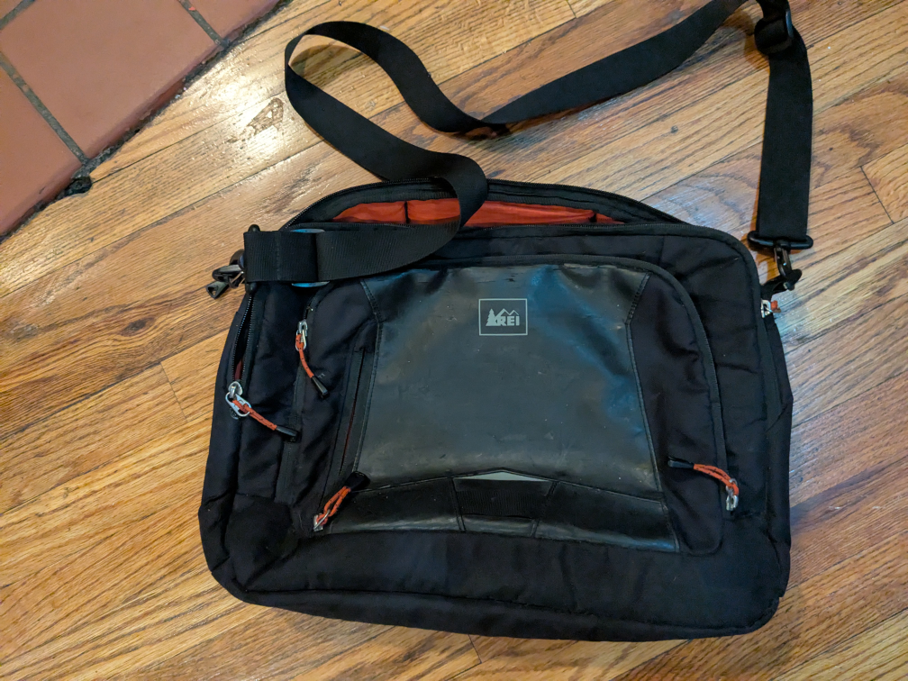 Selling a black REI laptop/messenger bag. It's in good condition, lightly used! plenty of pockets.