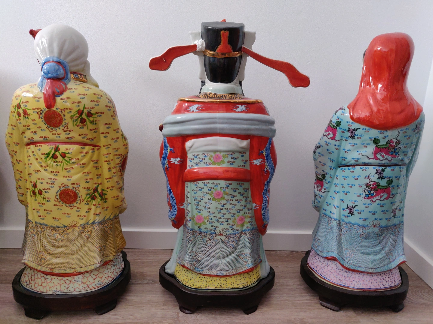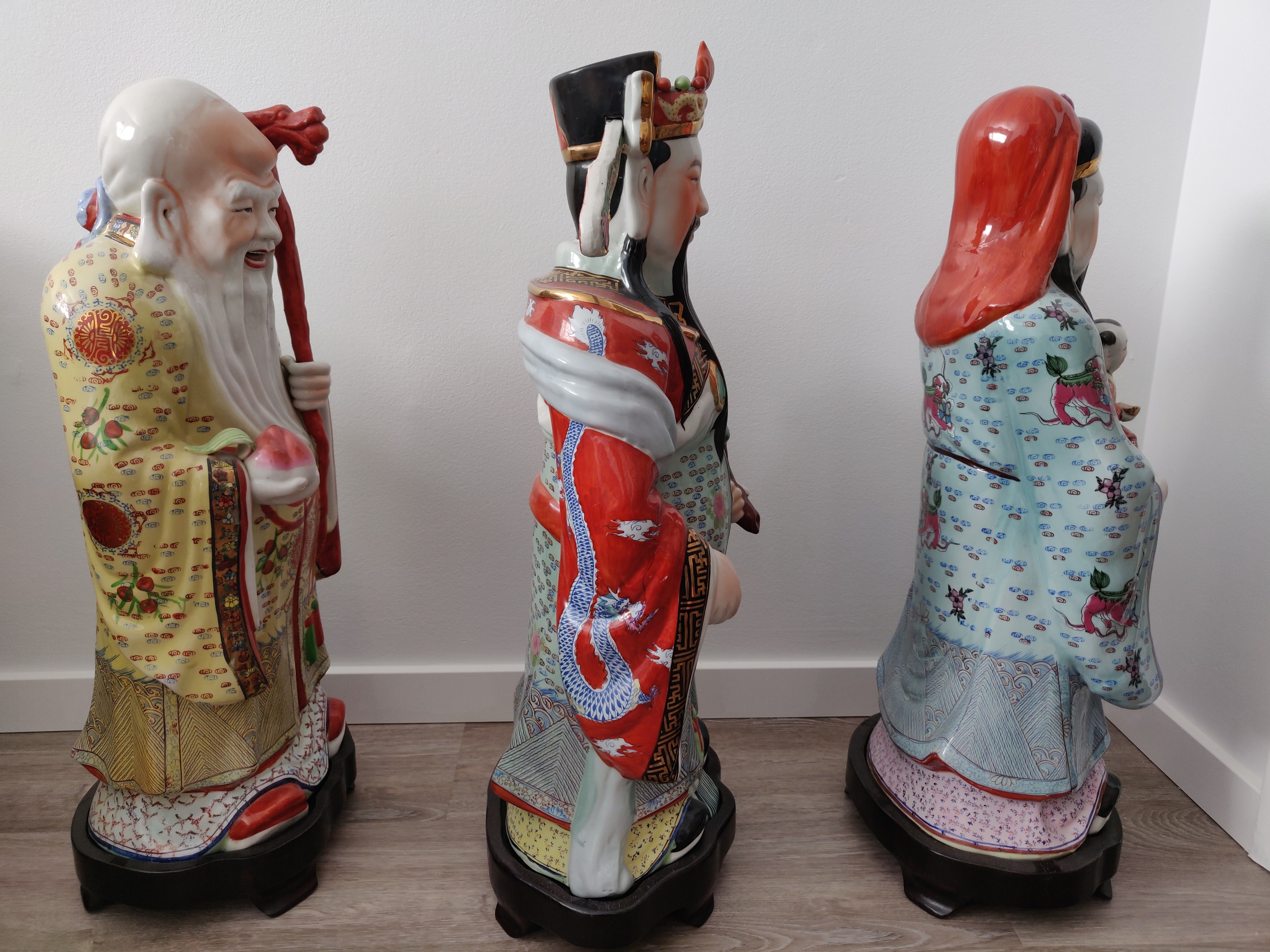 Set of Three Large 26" Fuk Luk Sau Statues w/ Custom Wood Stands
