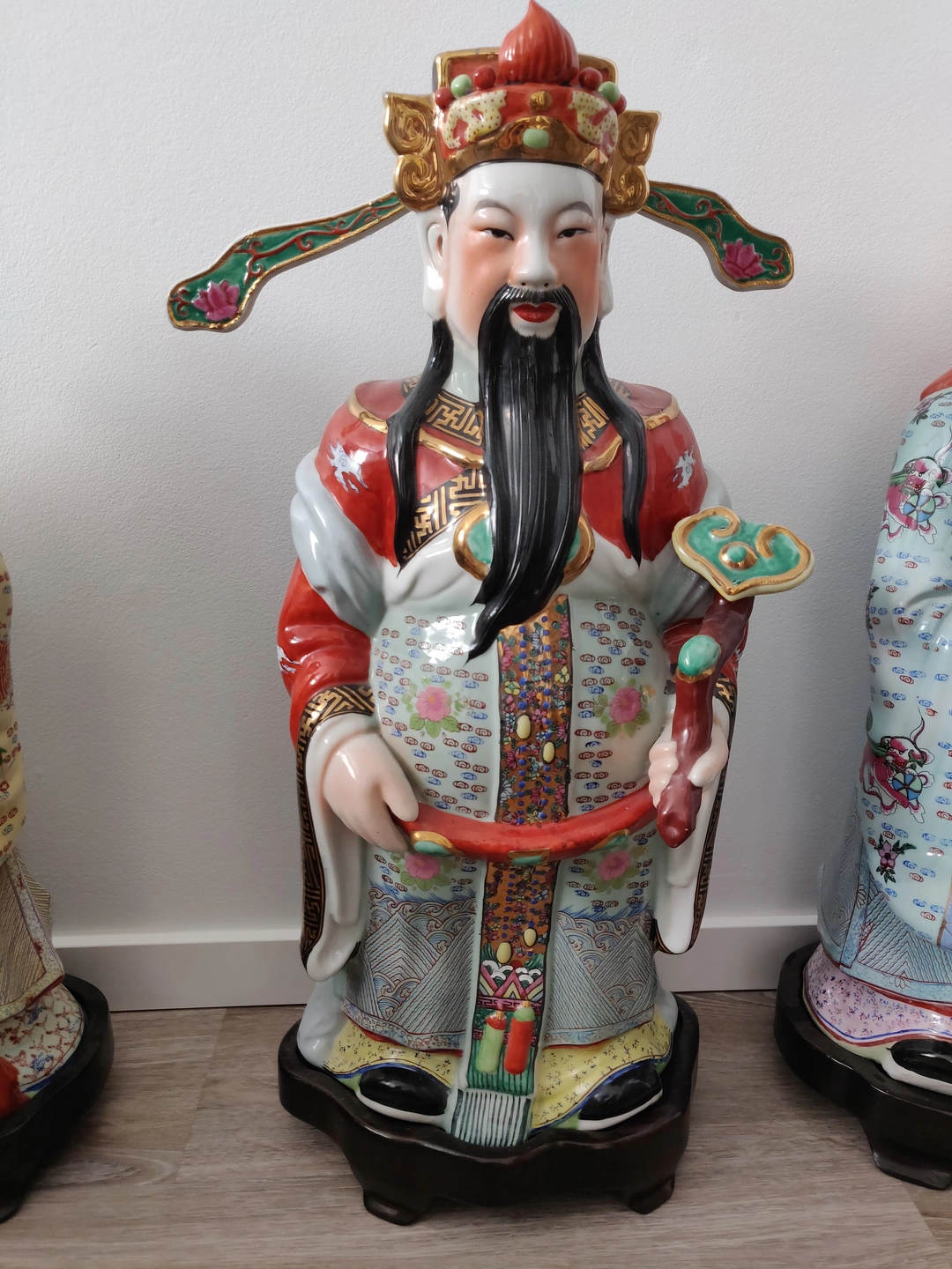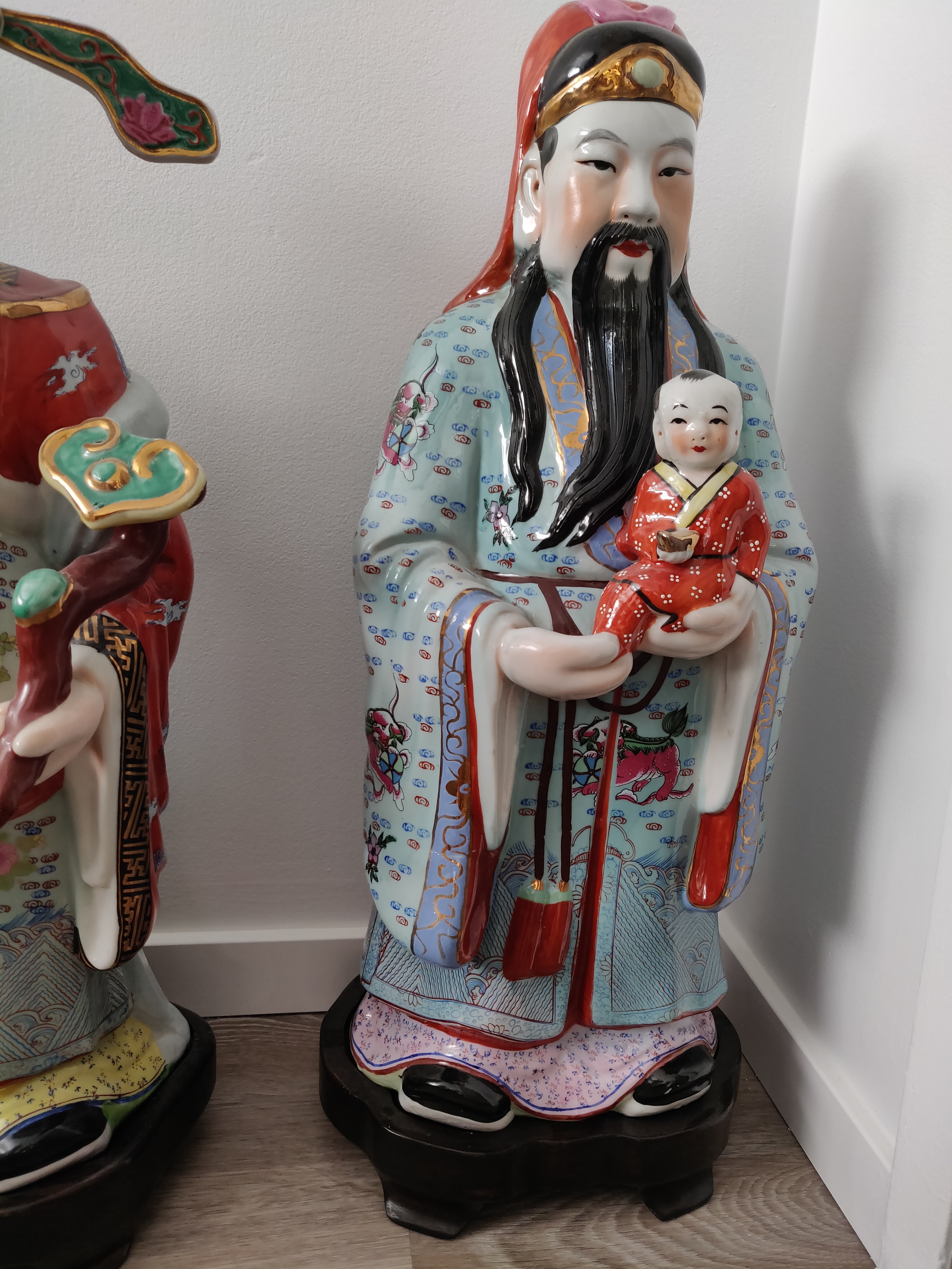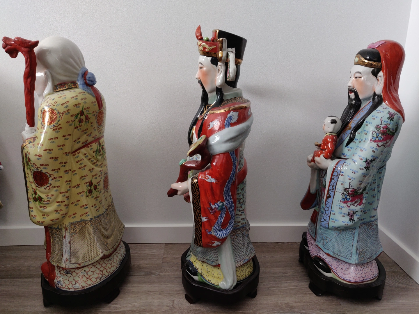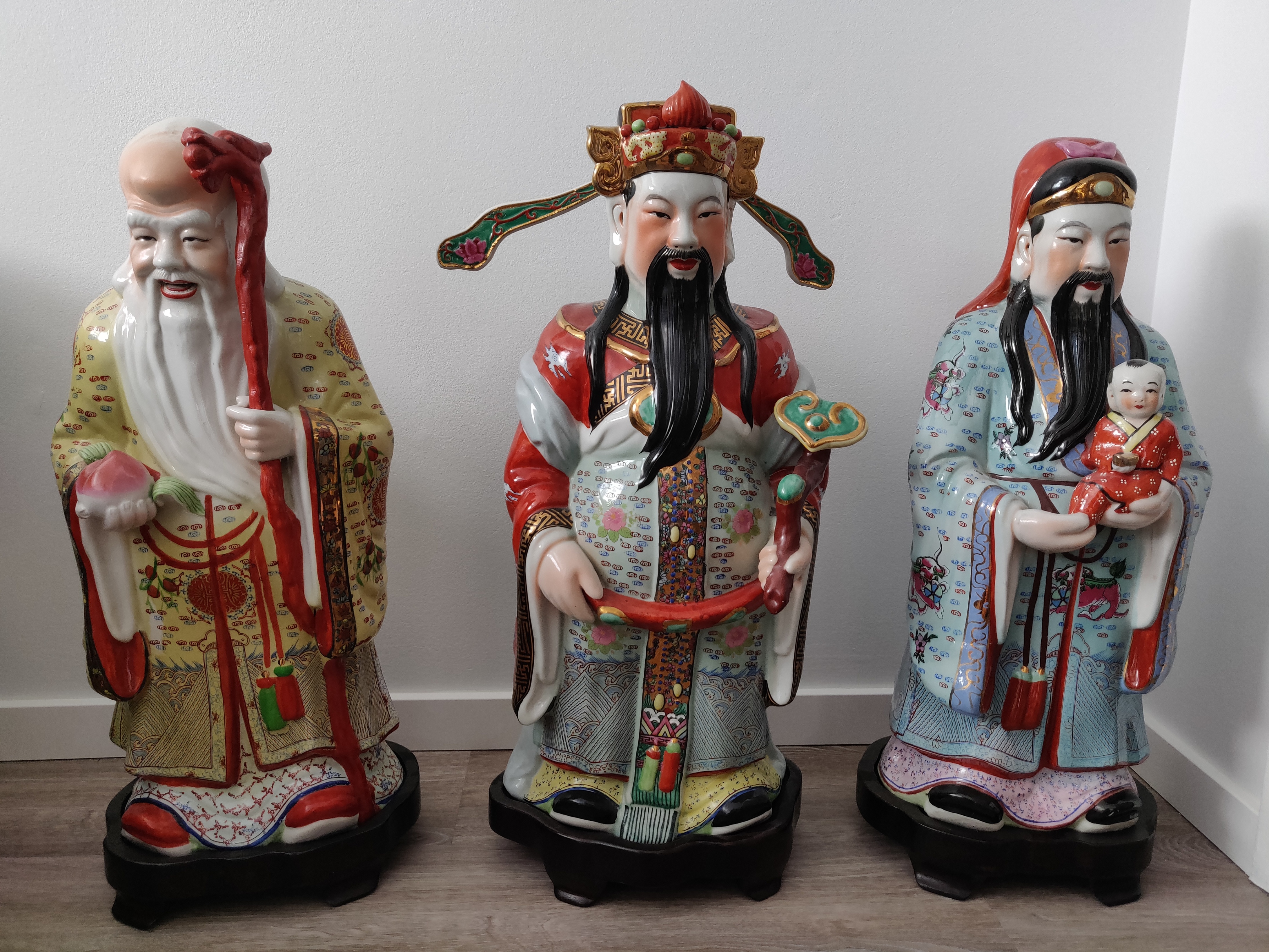 Fu (Fuk) - The God of Fortune: He is shown holding a child, symbolizing a full and happy life with a good family. His robe is intricately painted with traditional motifs.
