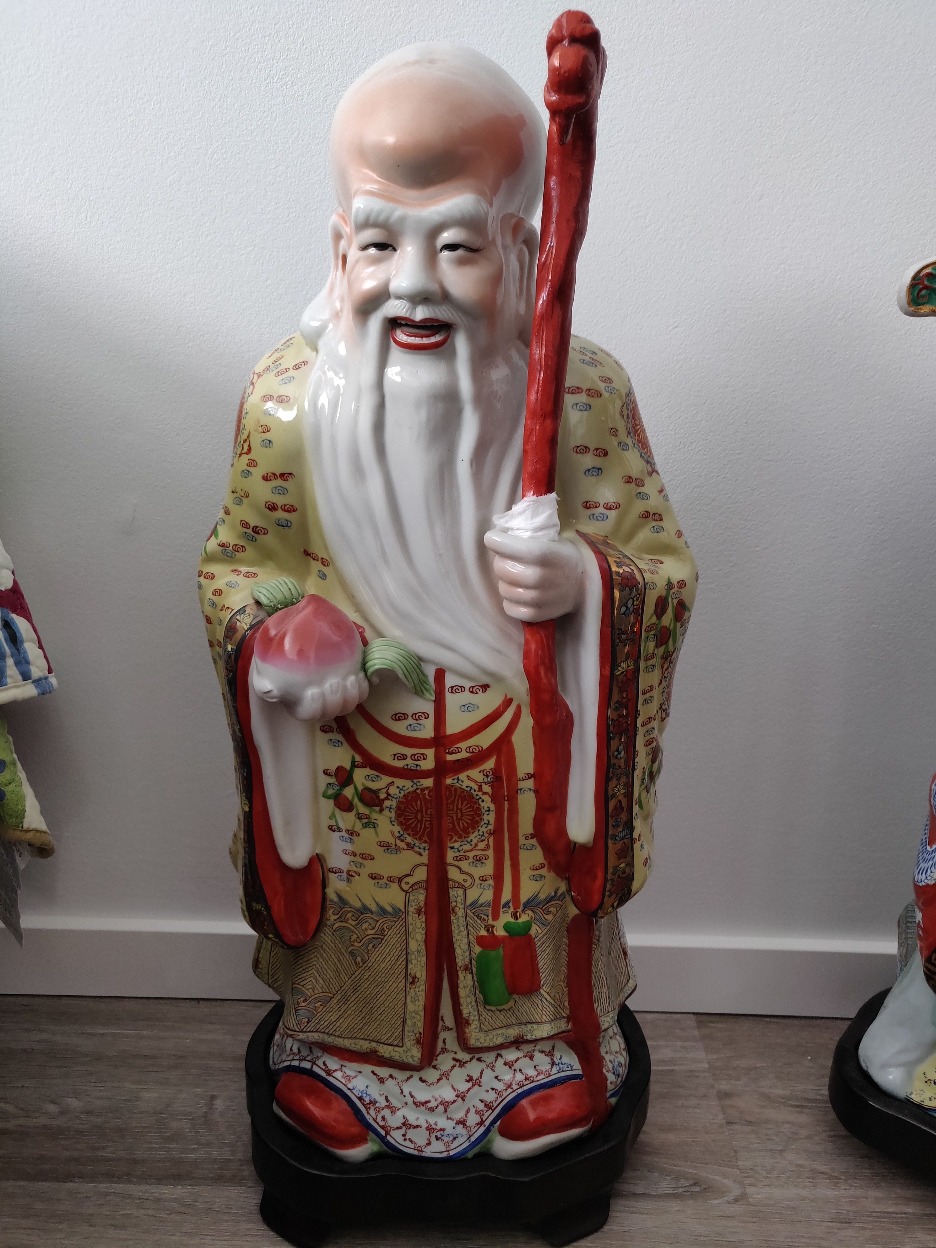 Shou (Sau) - The God of Longevity: Easily recognizable by his high, domed forehead and long beard, he holds a peach of immortality and a red staff, which are his traditional symbols.