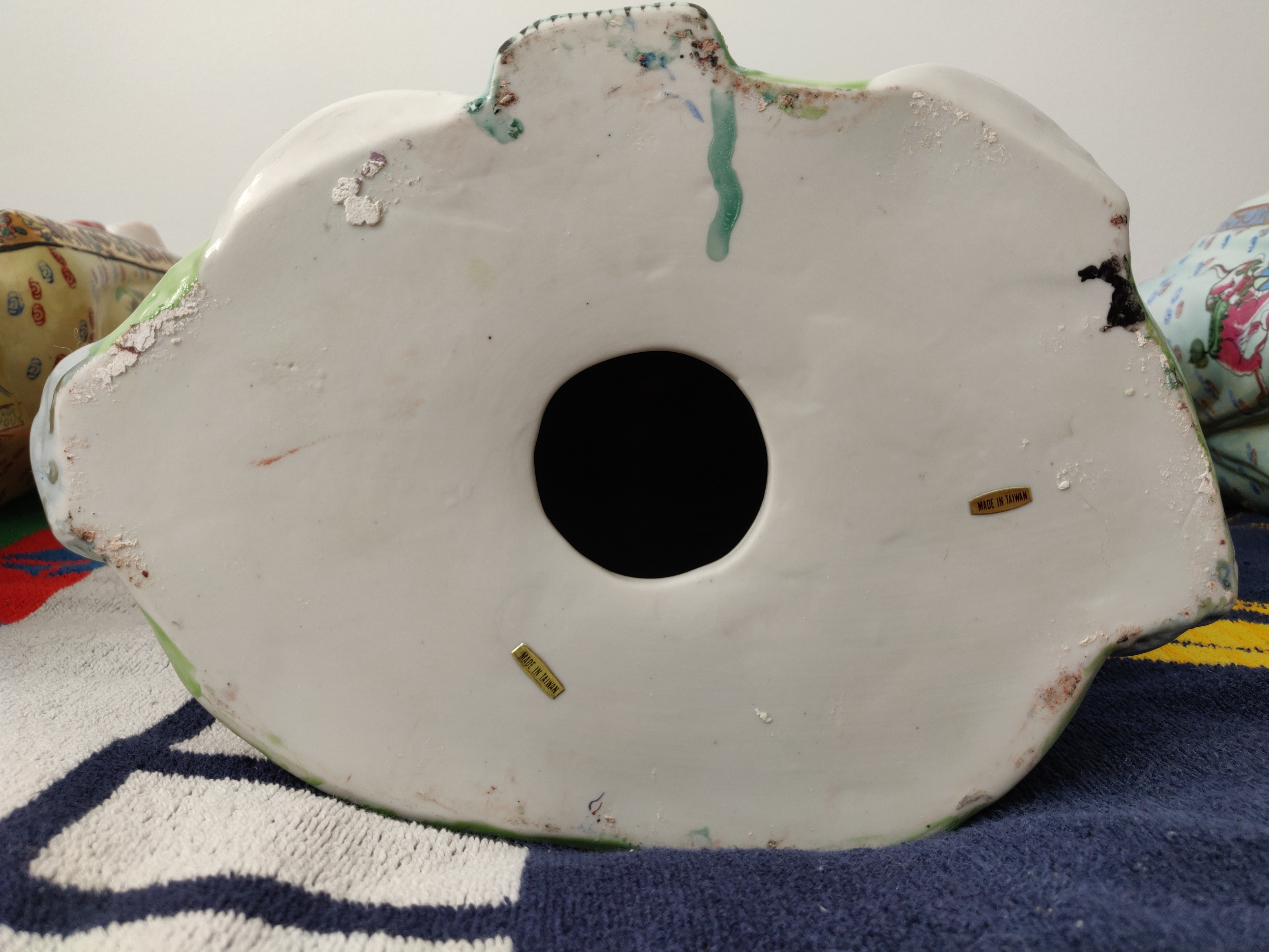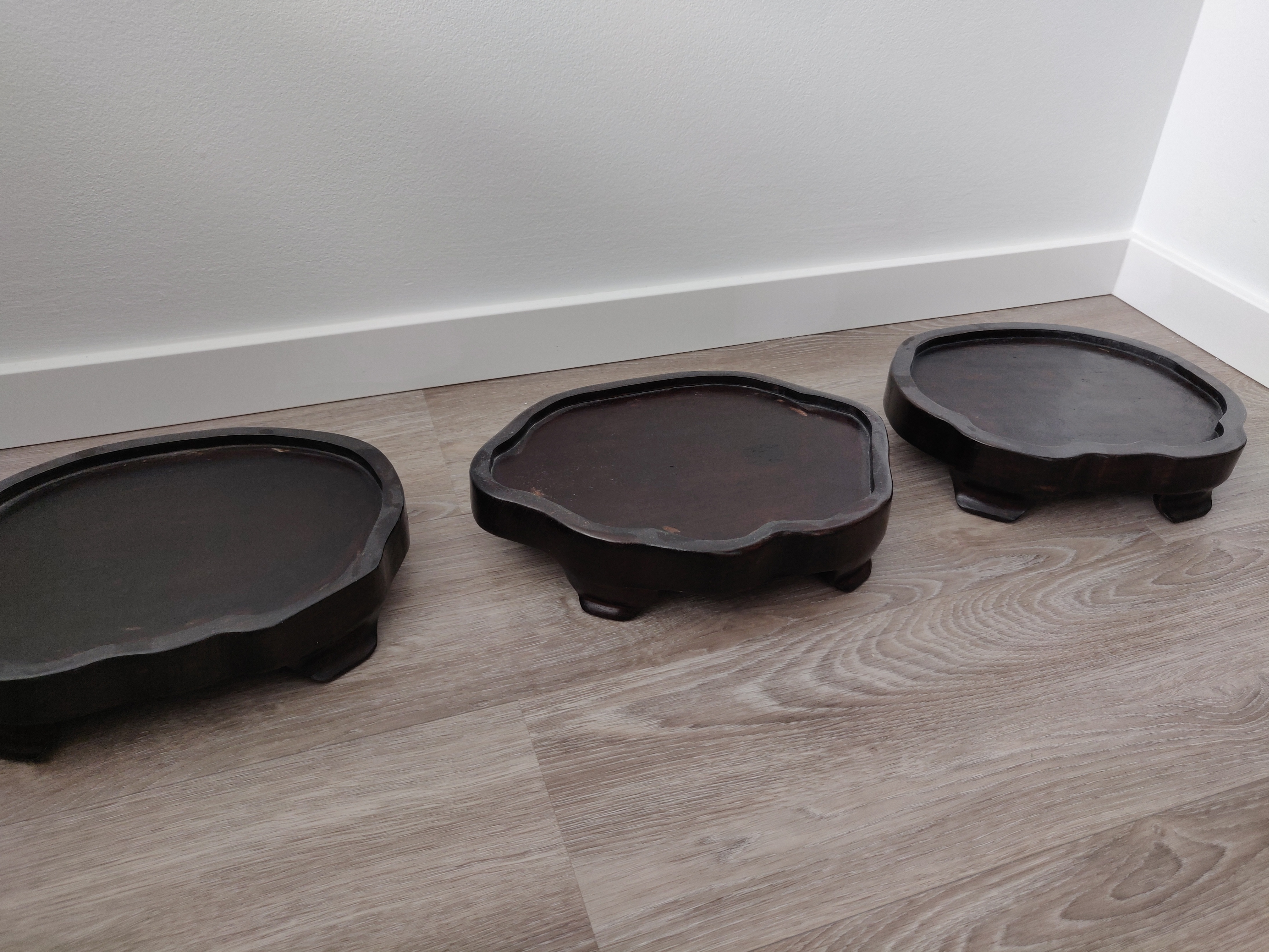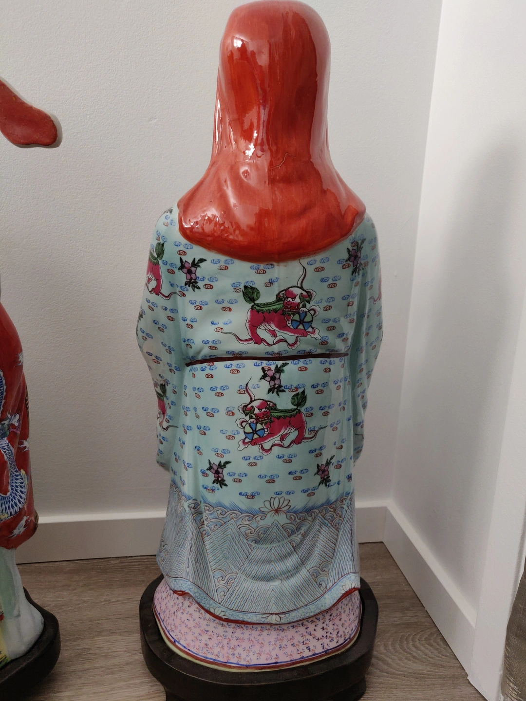The figurines are substantial in size and were clearly made with great care, featuring intricate hand-painted details on their robes and faces. The bases are hollow and have "MADE IN CHINA" stickers, indicating their origin. The accompanying stands are also beautifully crafted from solid wood with a natural, flowing shape that perfectly complements the statues.