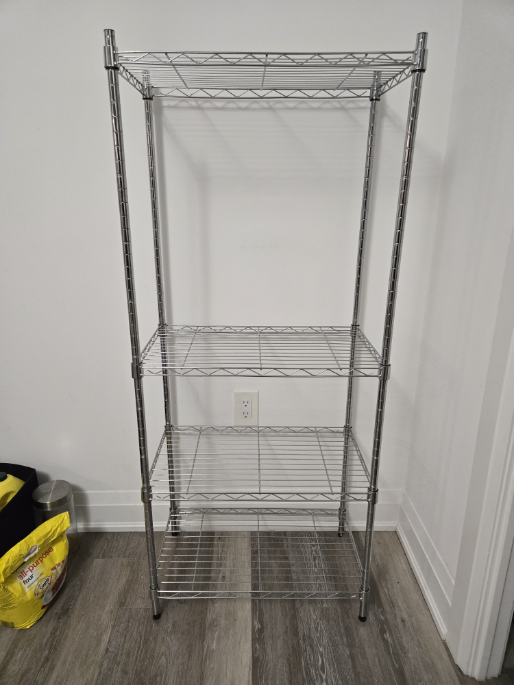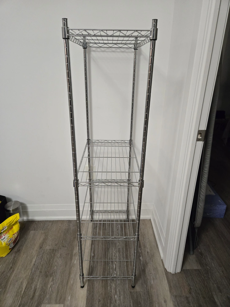 Selling a chrome wire shelving unit. It's in great shape and ready to help organize your space. Perfect for storage in a pantry, closet, or garage. It's sturdy and easy to assemble
