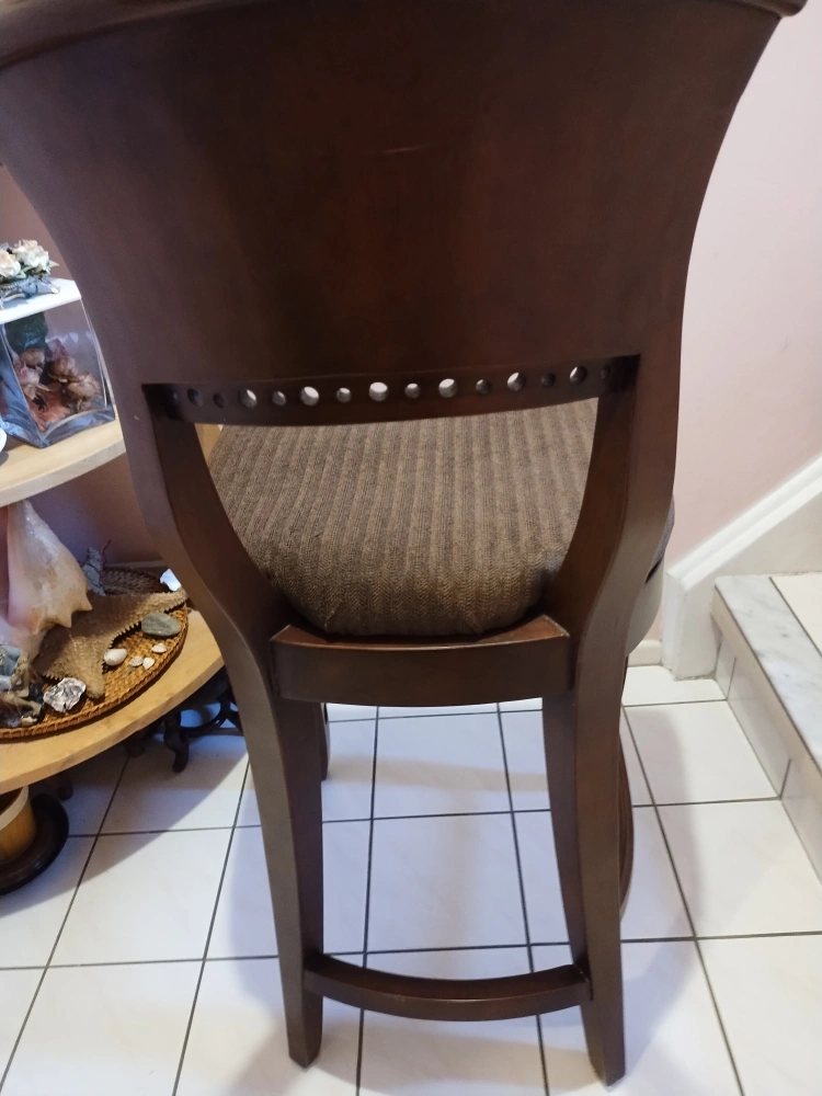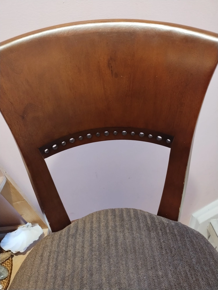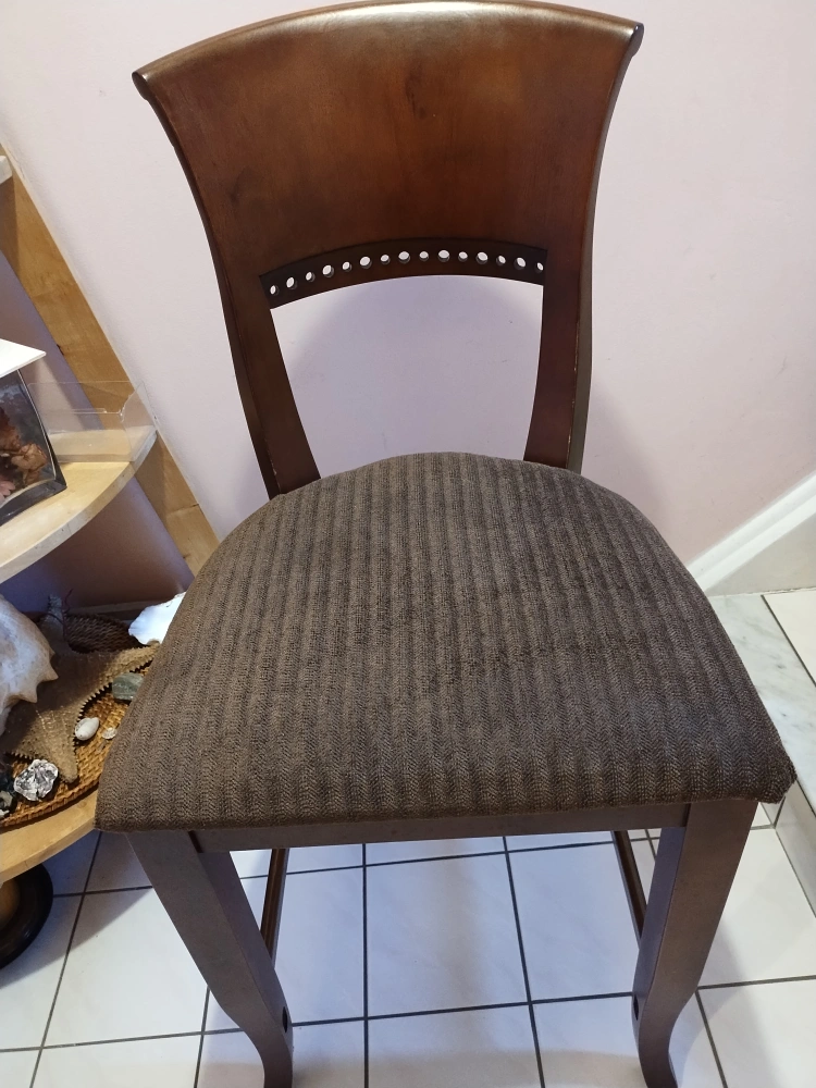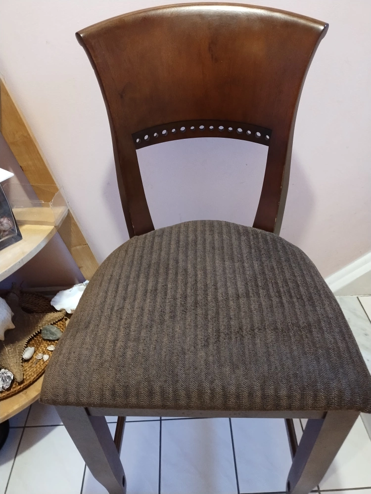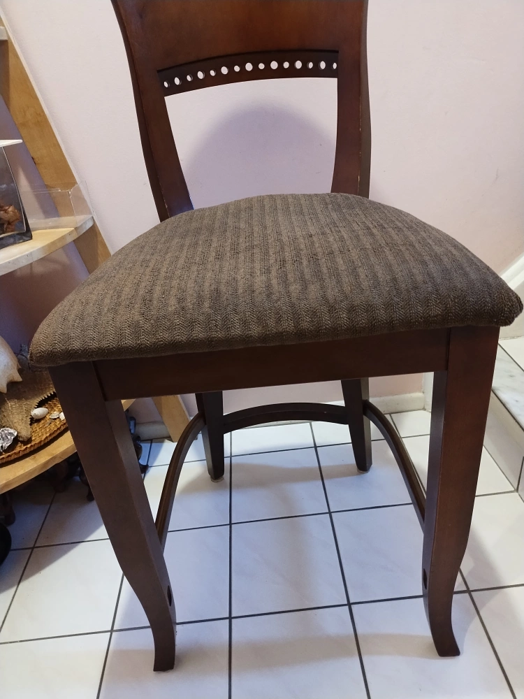 Selling a sturdy wooden bar stool! It features a comfortable upholstered seat in a neutral brown tone. The wooden frame has a classic design that would fit well in many kitchens or bar areas. It's in good condition and ready for a new home!