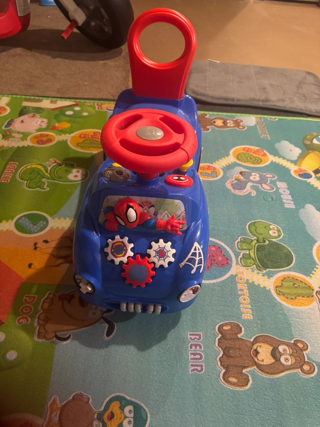Blue ride-on toy car featuring Spider-Man graphics. It has a red steering wheel and a handle for pushing. This toy is great for little ones learning to move around!