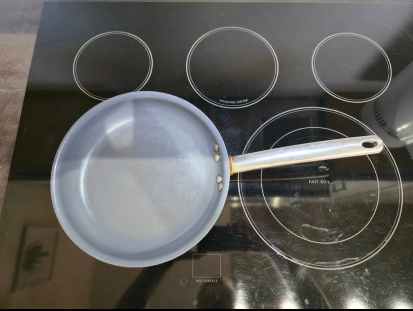 Cook with confidence using a 10-inch ceramic-coated frying pan. PTFE/PFOA-free, nonstick, and easy to clean. Features a riveted stainless steel handle, oven-safe build, and perfectly even heat on ceramic glass stovetops. Great condition with only light signs of use.