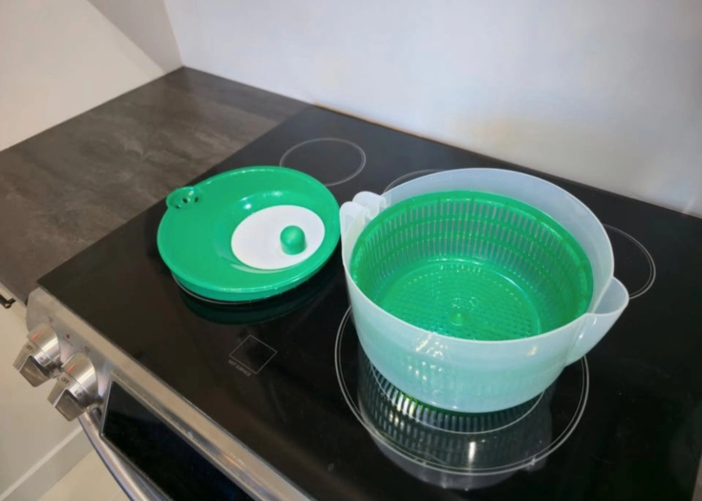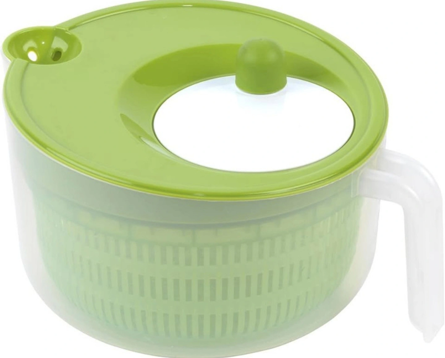 Make quick work of rinsing and drying your greens with a high-capacity GoodCook Salad Spinner in fresh green. Its translucent basket doubles as a colander, and the large outer bowl has a pour spout and easy-grip handle. Compact yet roomy, dishwasher safe, and barely used.