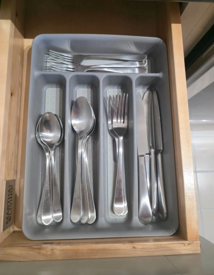 Also included is a complete 16-piece stainless steel cutlery set with 4 knives, 4 dinner forks, 4 tablespoons, and 4 teaspoons. Comes with a Martha Stewart Living grey cutlery tray. Clean, modern, and ready to use.