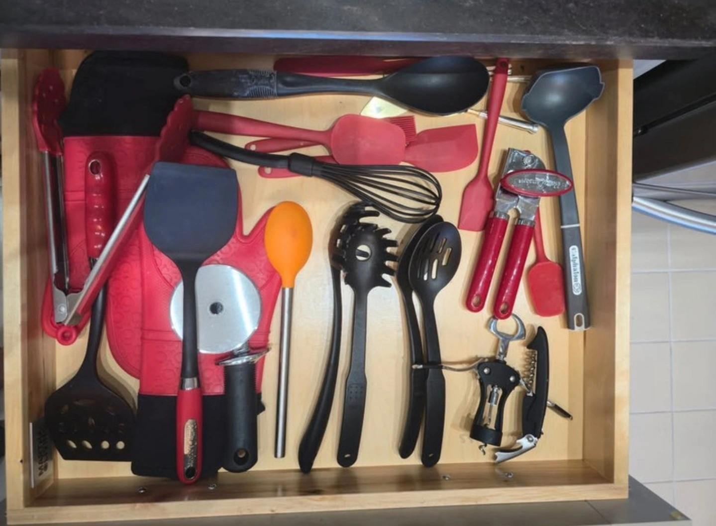 Finally, a full drawer of kitchen tools — spatulas, tongs, ladle, whisk, pasta spoon, can opener, pizza cutter, turkey baster, heat-resistant gloves, corkscrew, and more. Everything is clean and in great condition, perfect for stocking or upgrading your kitchen.