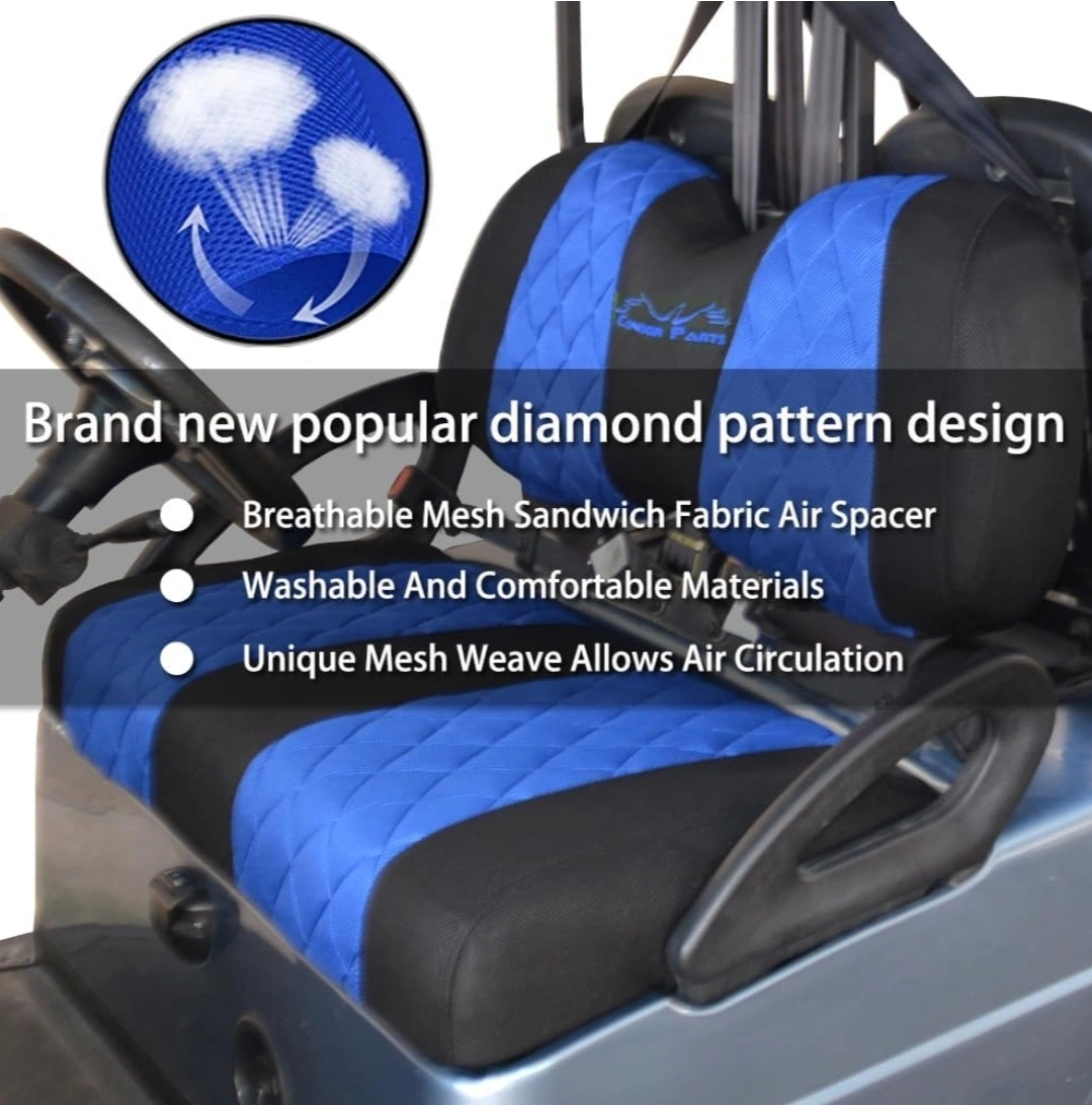 Transform your ride instantly! These high-quality golf cart seat covers are a stylish & affordable upgrade — ideal for restoring old seats or giving your cart a bold, new look. Made from breathable polyester mesh, they're perfect for hot days, easy to clean, and super comfy.