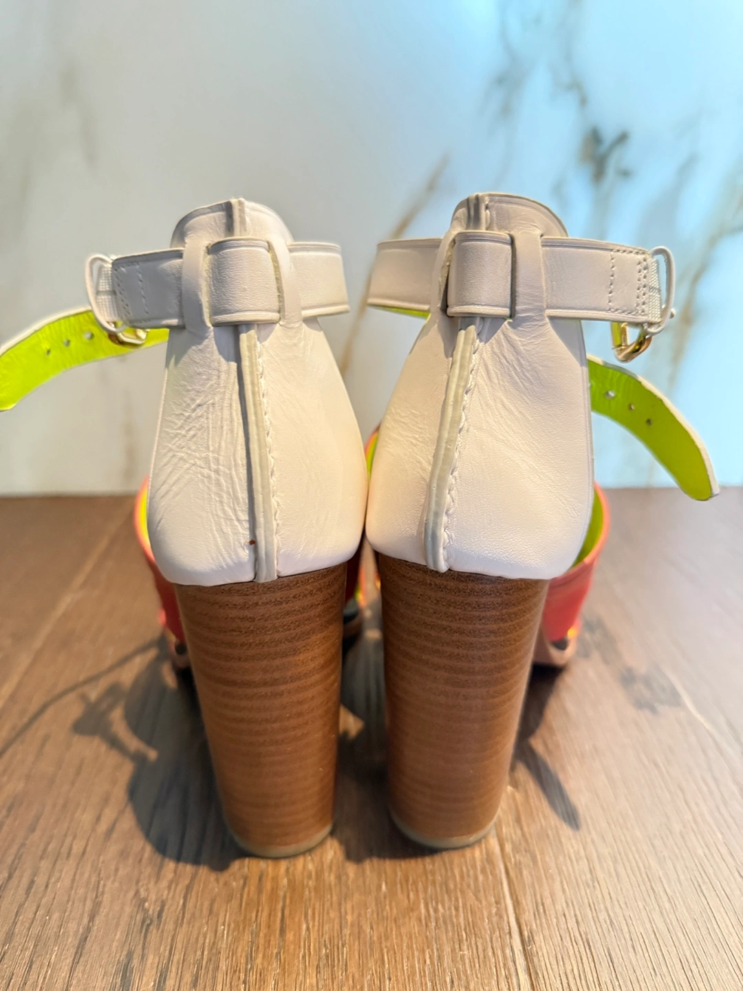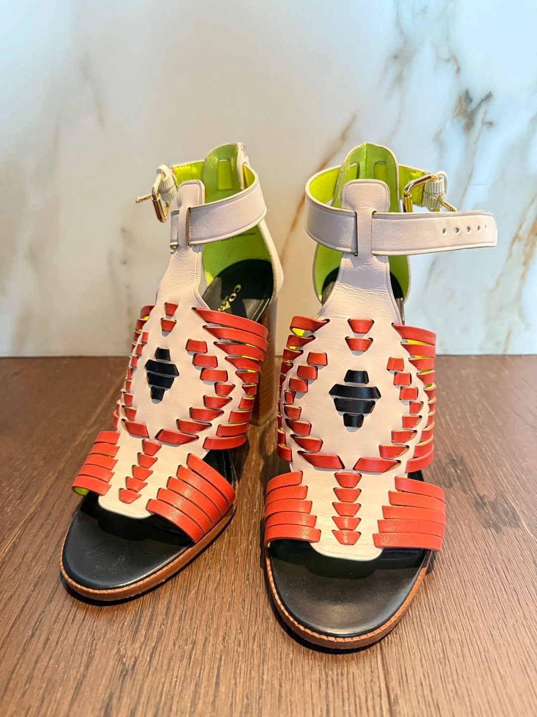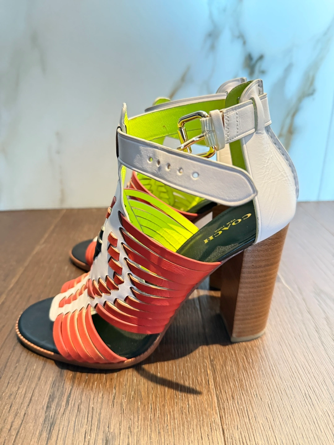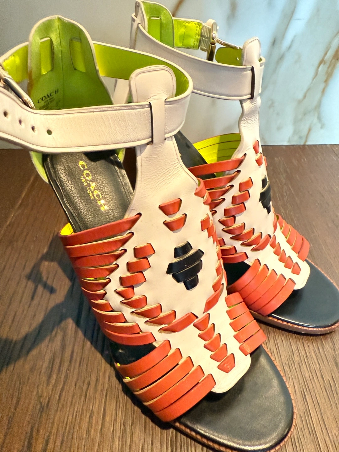 481These Coach sandals are a stylish addition to any wardrobe! The woven leather design in shades of white, orange, and black is eye-catching. They feature an ankle strap for a secure fit and a comfortable heel height. Perfect for dressing up or down!
