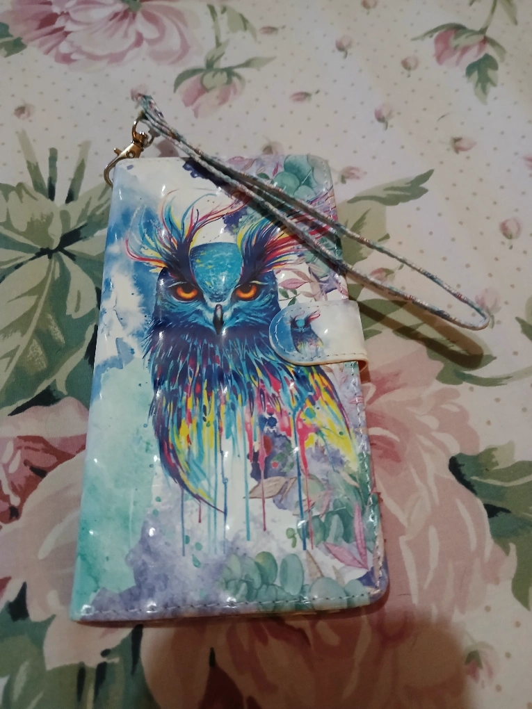 Cute phone wallet case with a colourful owl design! It has a wrist strap and slots for cards inside. The case is like new and never used ready for a new home.