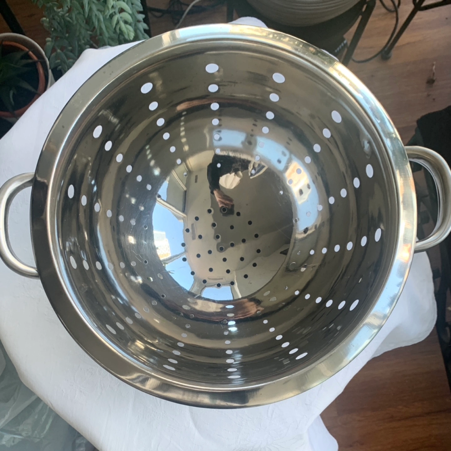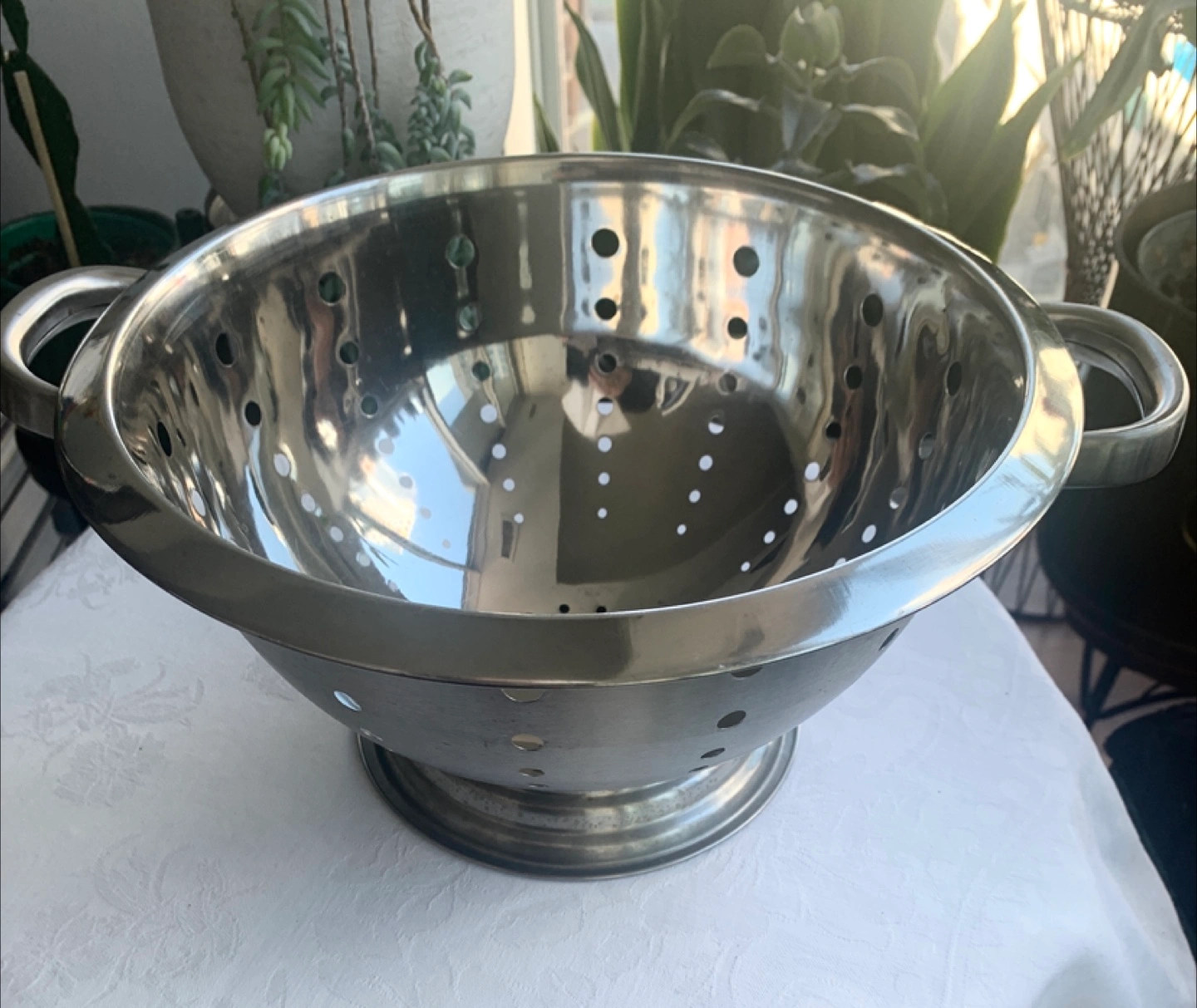 Large stainless steel colander. Features two handles and a wide base. Ideal for straining pasta or washing vegetables.