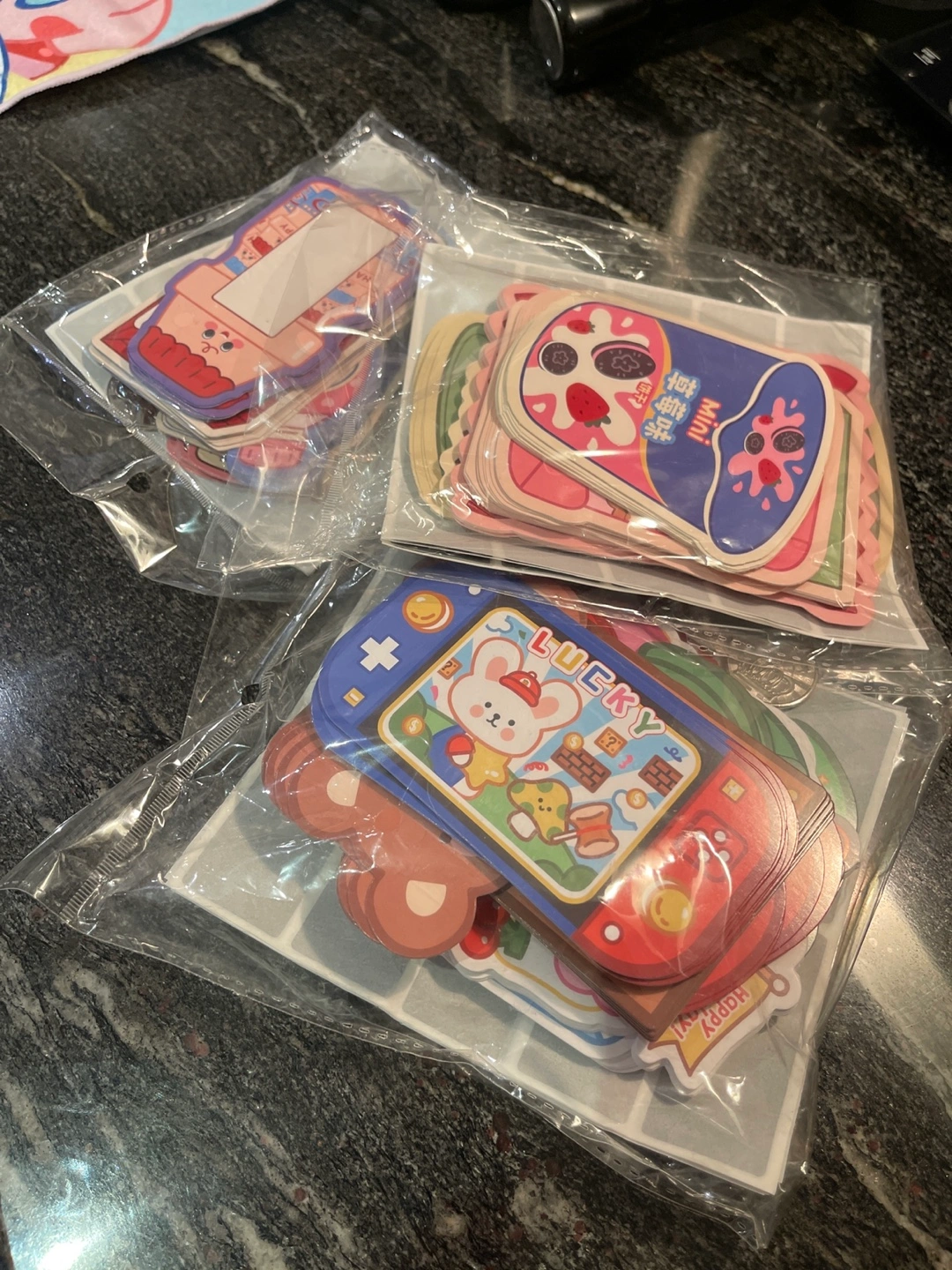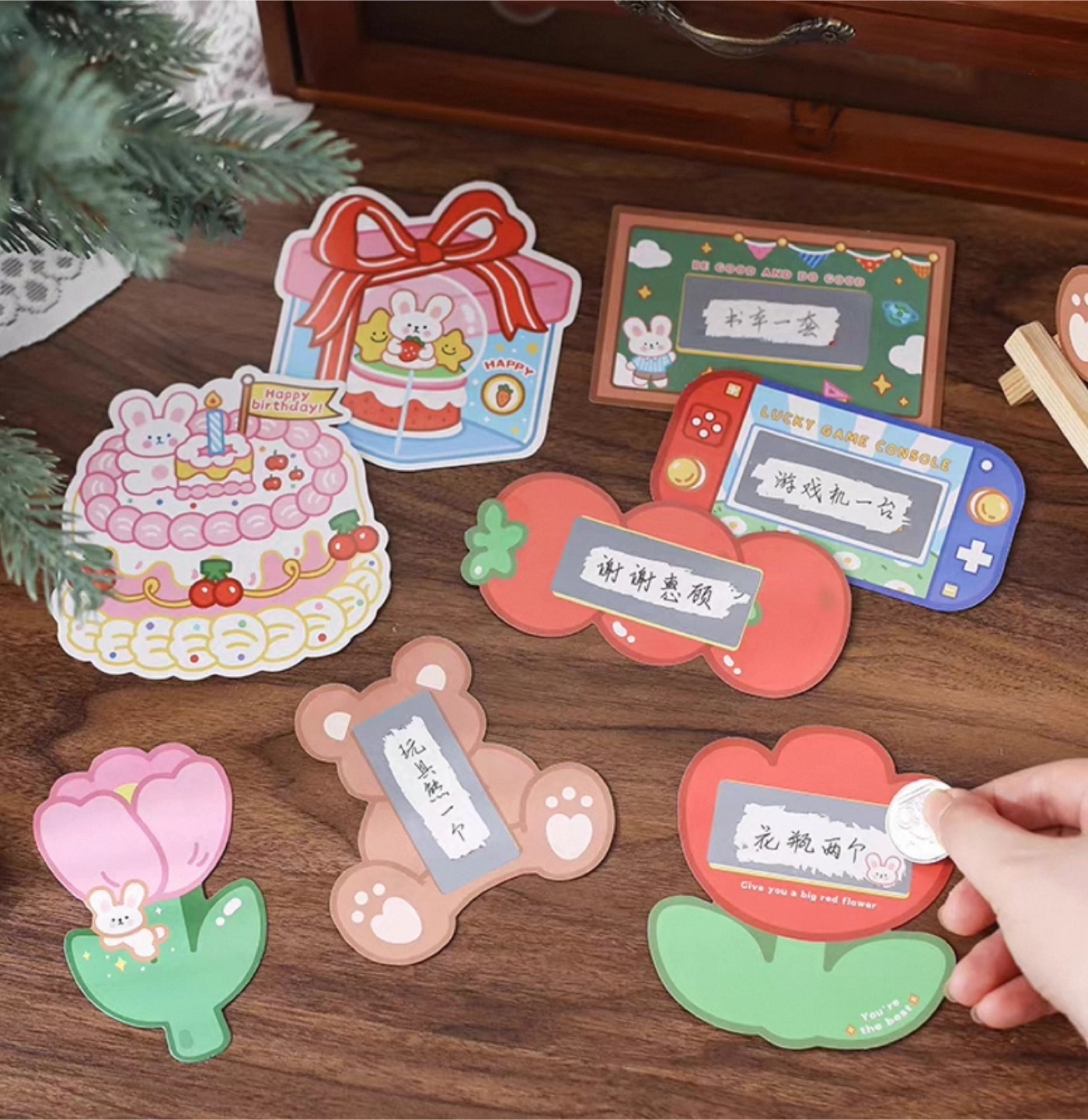 These are some adorable scratch-off card stickers! They come in a variety of cute designs like cakes, bears, flowers, and even a little game console. Perfect for adding a touch of fun to your crafts or gifts.