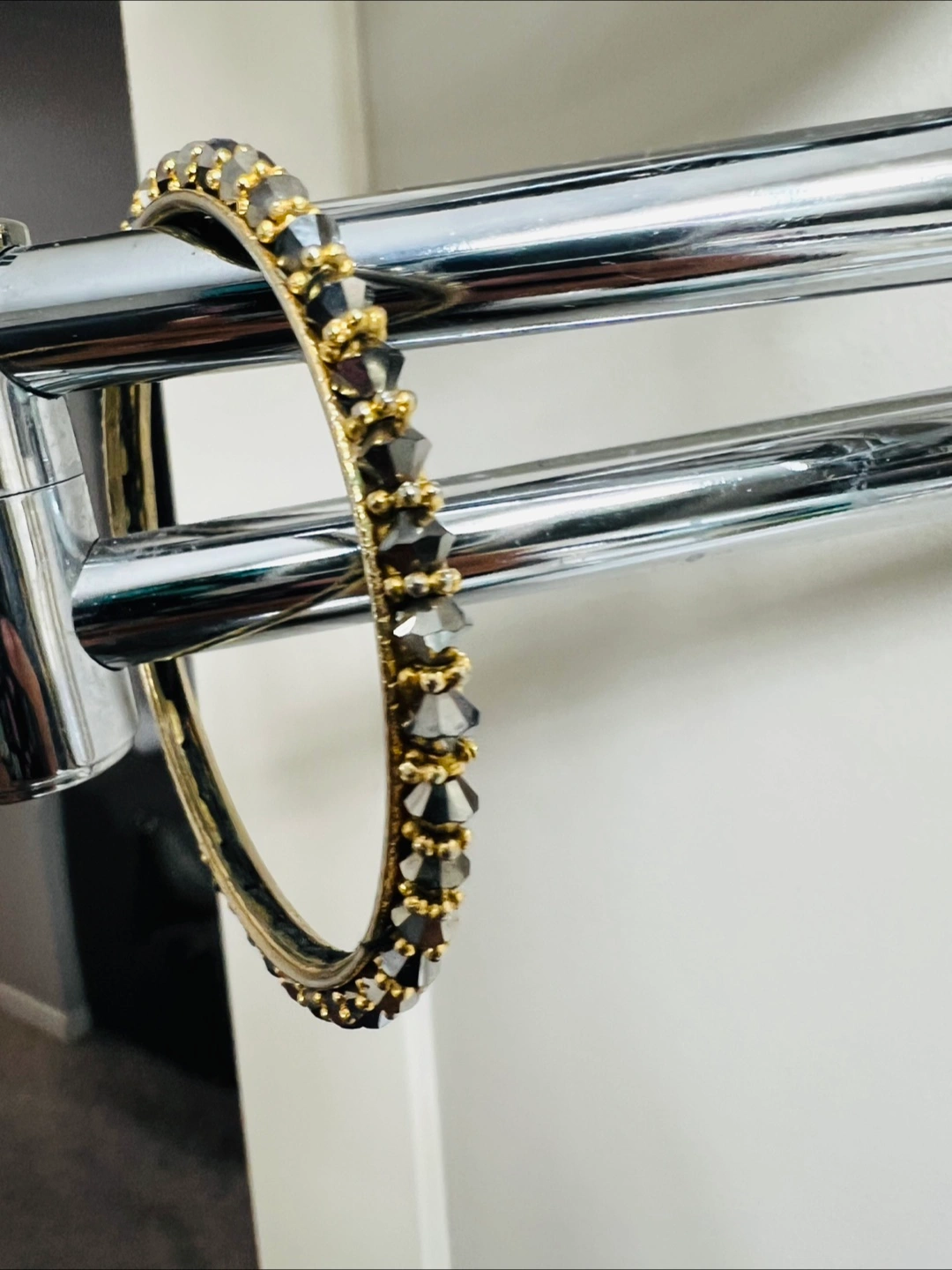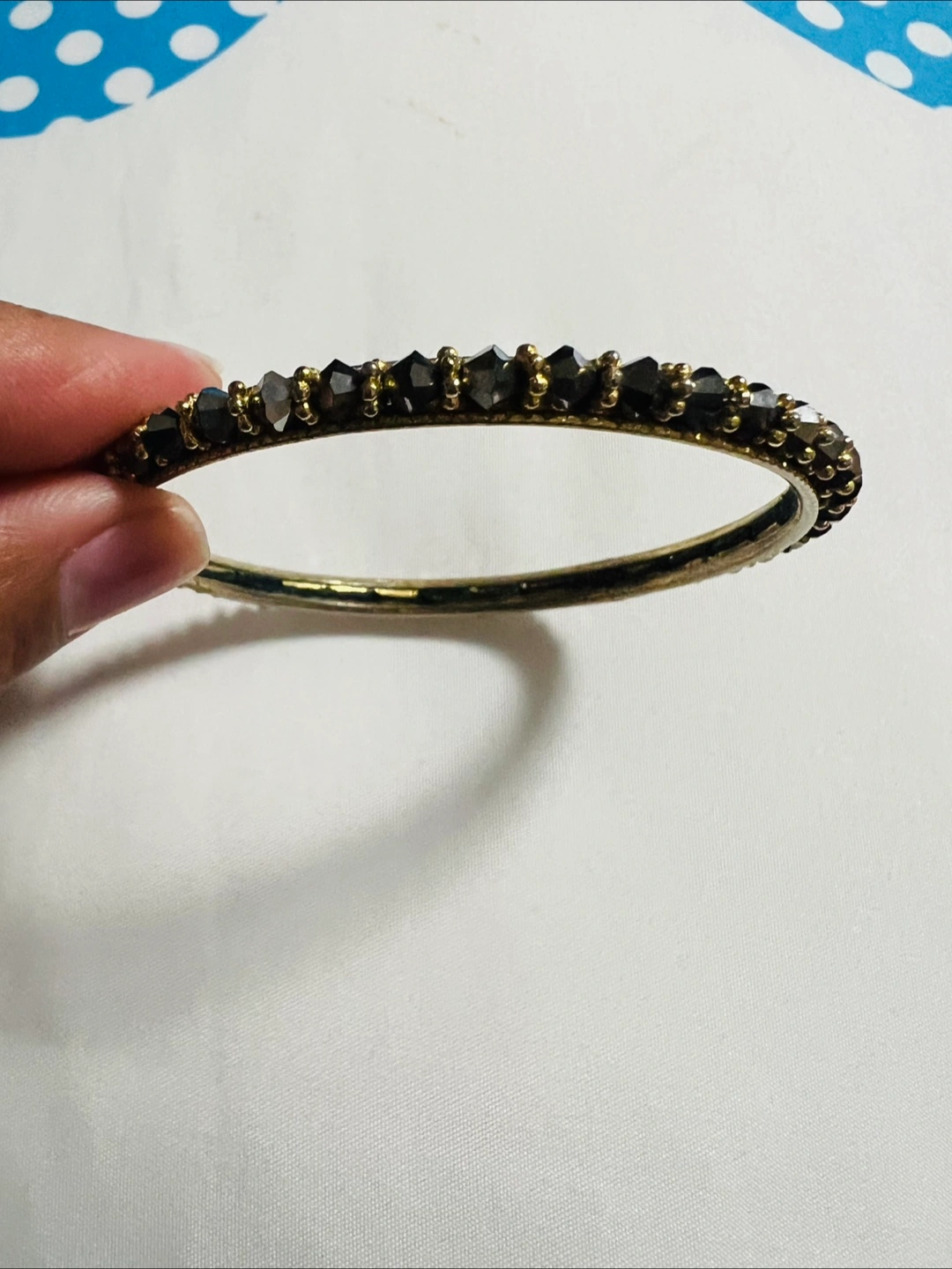 Here's a lovely sparkly bangle bracelet! It features what looks like blackish grey faceted stones set in a gold-tone metal. It's in great condition and ready to add some sparkle to your outfit.