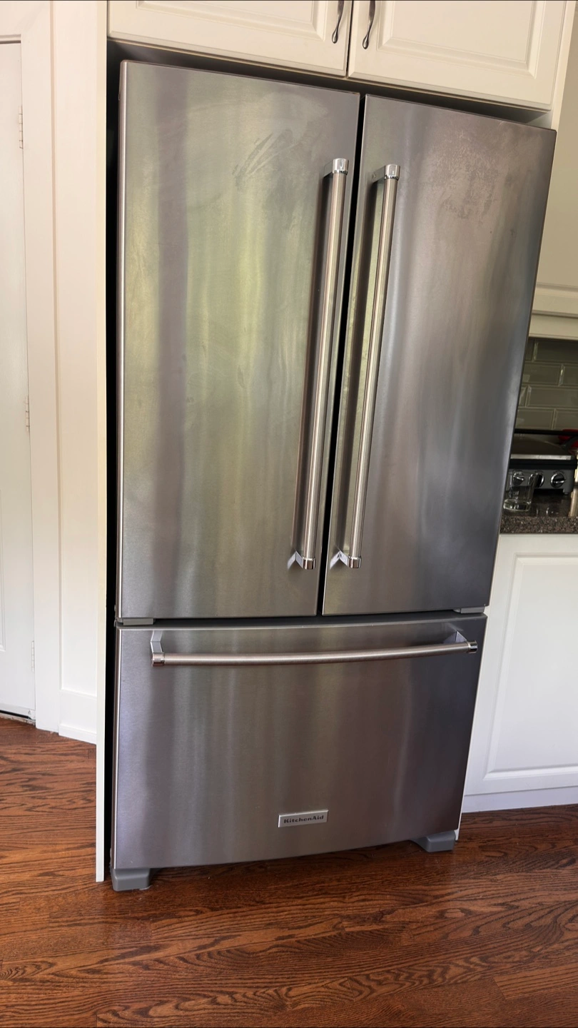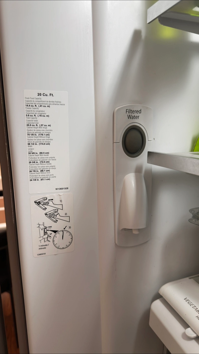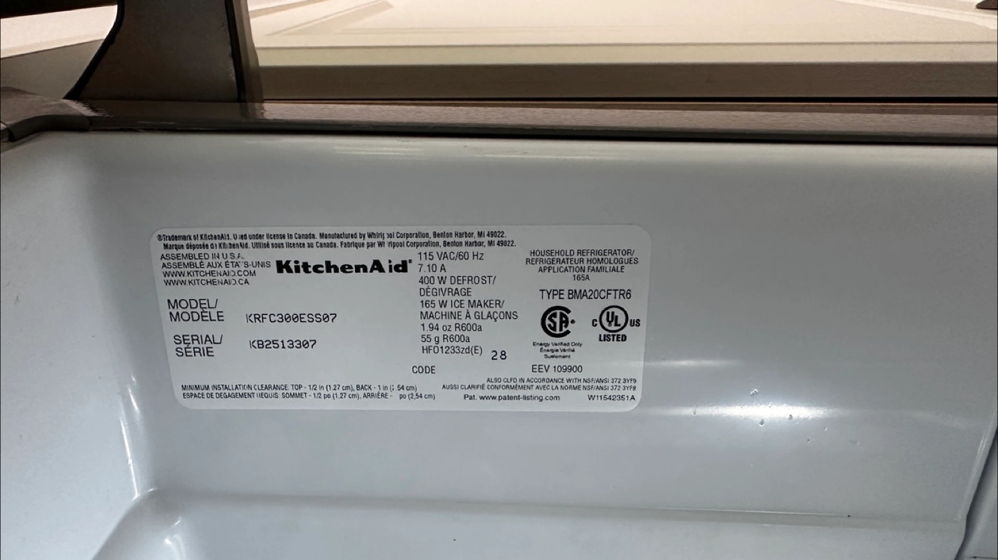 Selling a KitchenAid refrigerator with a 20 cu. ft. capacity. The model number is KRFCS300ESS07. It features a filtered water dispenser and an ice maker. The refrigerator has a household refrigerator/refrigerator assemblage and uses 115 VAC/60 Hz.