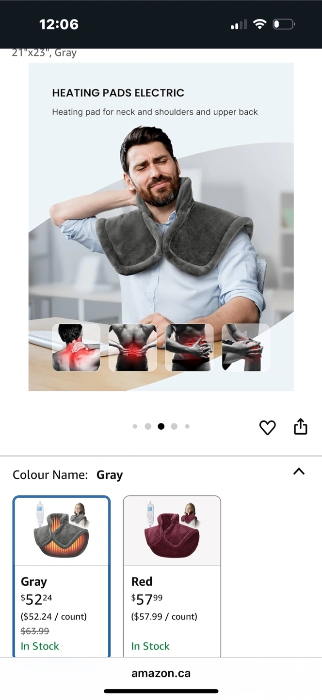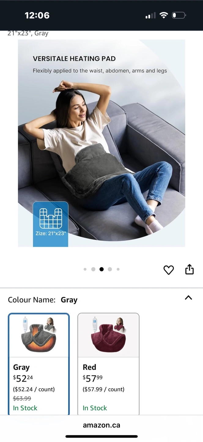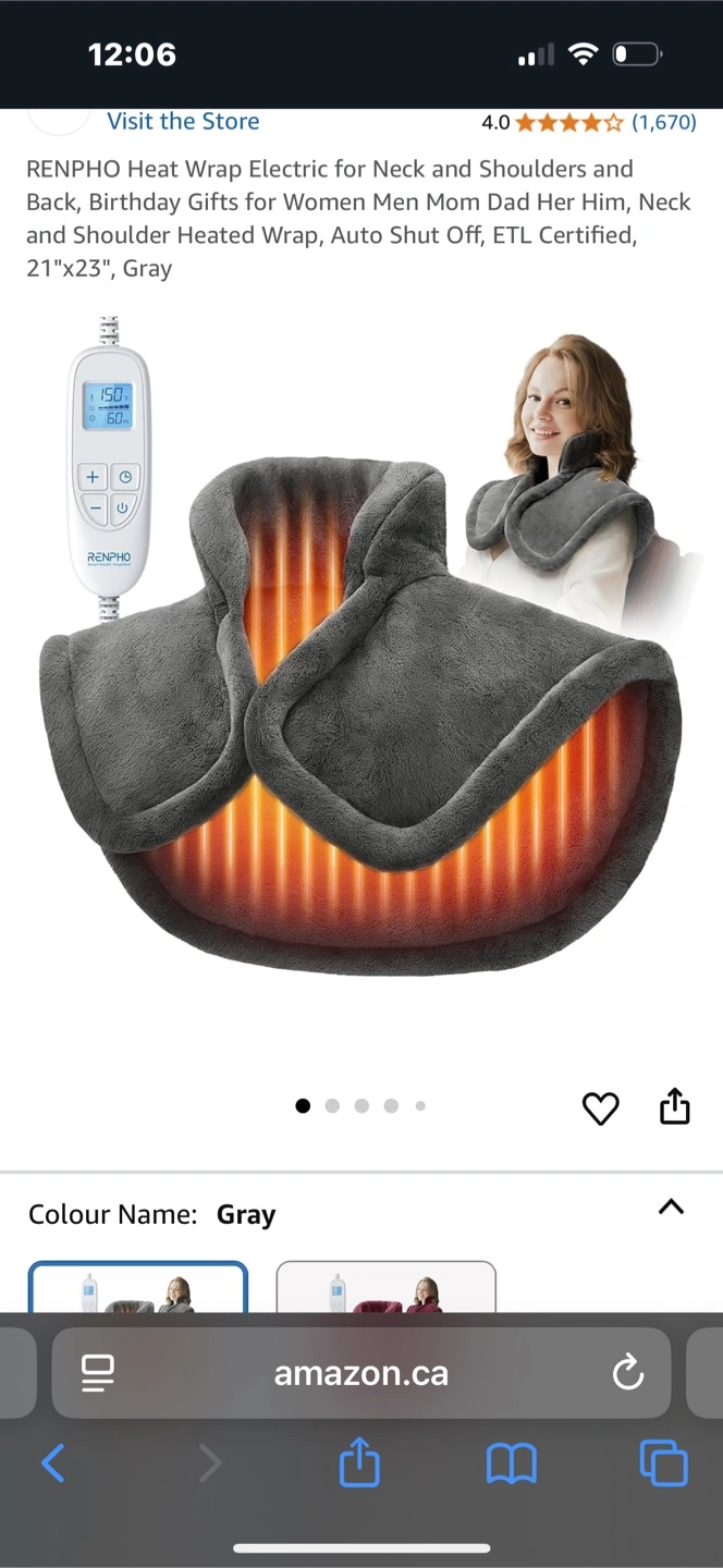 I'm selling a RENPHO heat wrap, perfect for neck, shoulders, and upper back! It's a heating pad that's flexibly applied to the waist, abdomen, arms, and legs. The colour is gray, and the size is 21"x23".
