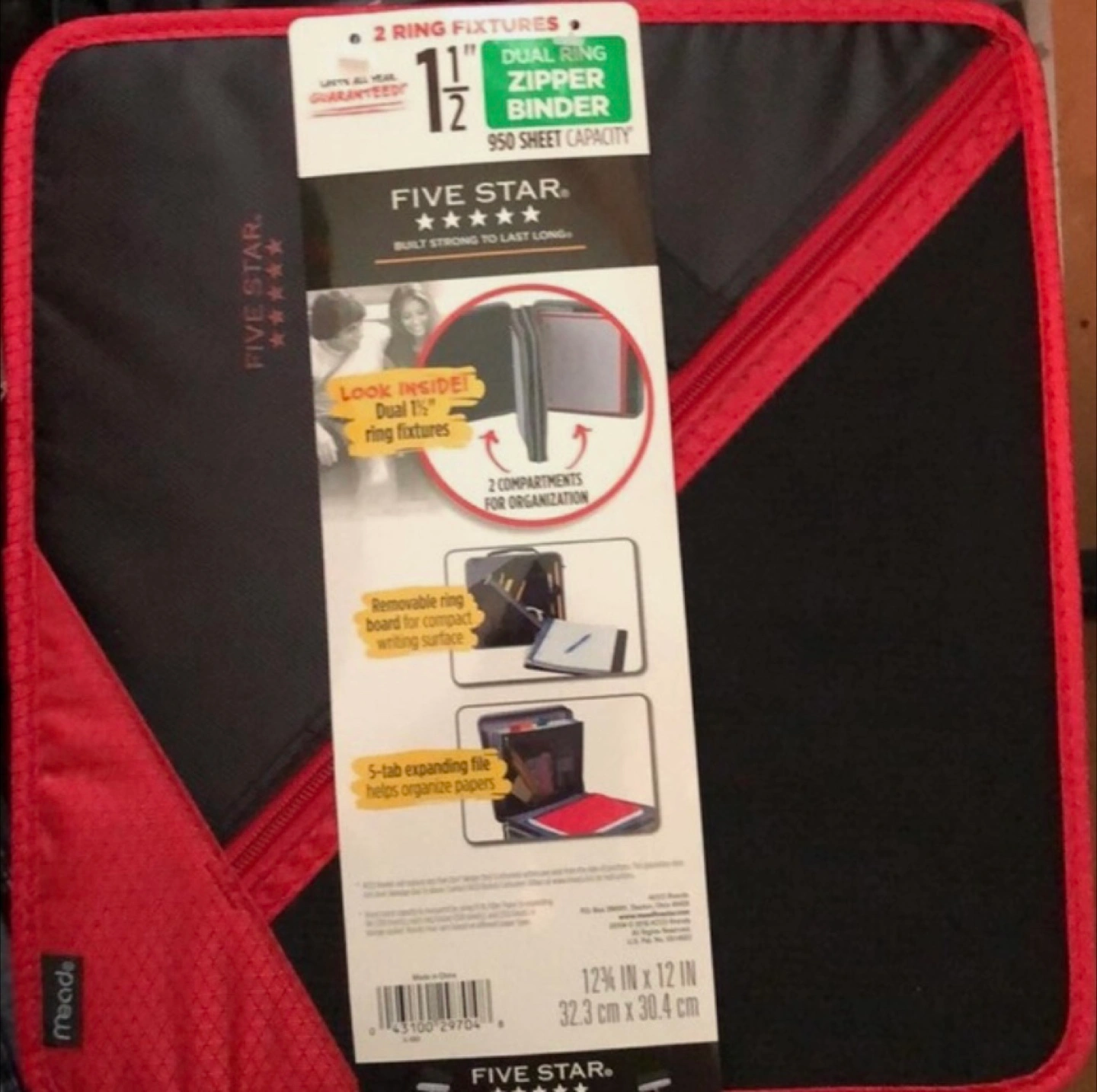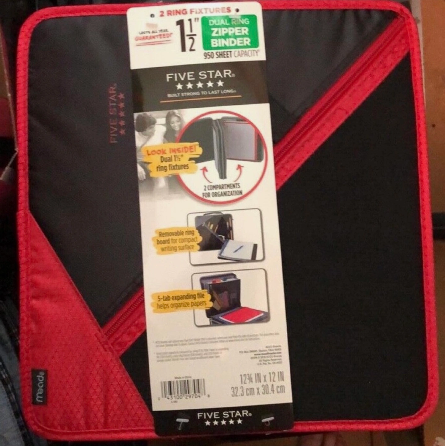 Selling a Five Star 1 1/2 inch dual ring zipper binder! It is in like new condition and ready to help keep your papers organized. It has a 950 sheet capacity and features 2 ring fixtures.