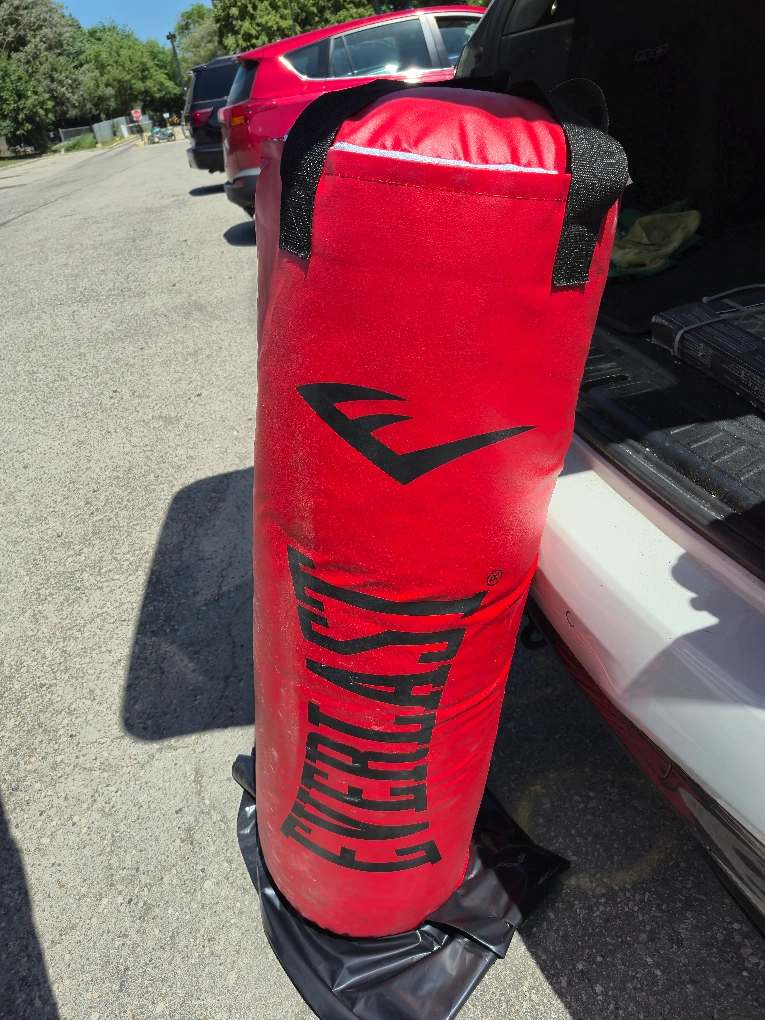 Selling a red Everlast heavy punching bag. It's in good condition and ready for a new home gym! Perfect for getting in a great workout. it's have little ripped but fix how you see in pictures
