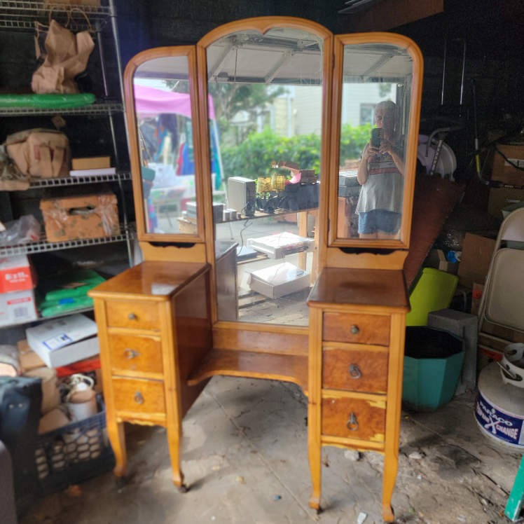 1 / 31 / 3Buy & SellAntique 3 mirror vanity dresserAntique 3 mirror vanity dresser$125Beautiful dresser, perfect for lingerie and makeup. Early 1900s, very good condition, some wear on the veneer on bottom drawers. Has casters. ConditionGoodWHERE TO MEETCheck LocationView MapSELLERverifiedSandraRidgewood1134 reviews1 chats·12 favorites·213 viewsSEND CHAT TO SELLERHi Sandra! I’m interested in your listing.Hi Sandra! I’m interested in your listing.Get the Karrot app to chatSign In to chat