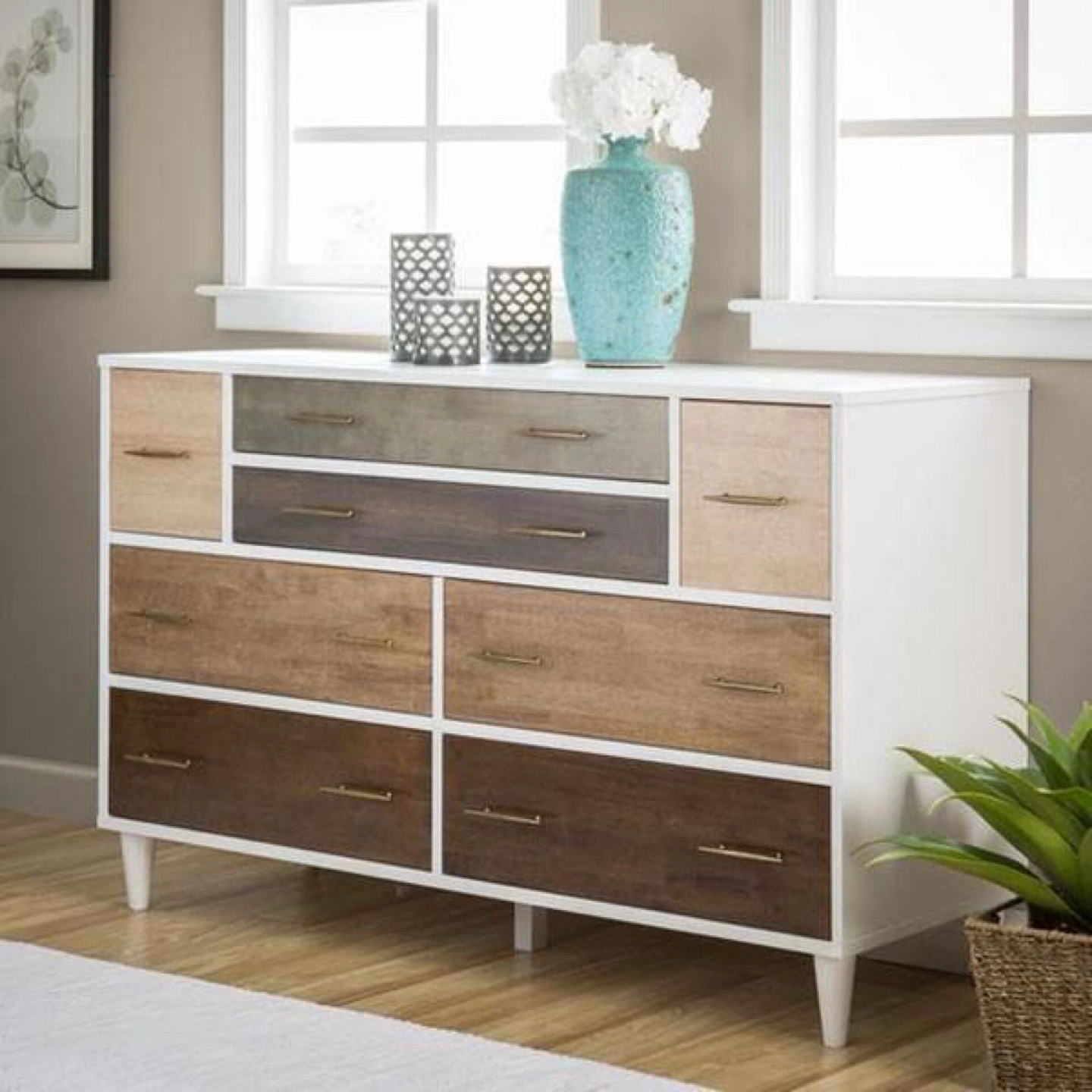 West Elm Style dresser with a unique design! It features multiple wood-tone drawers and a white frame. It would be a great addition to any bedroom or living space.