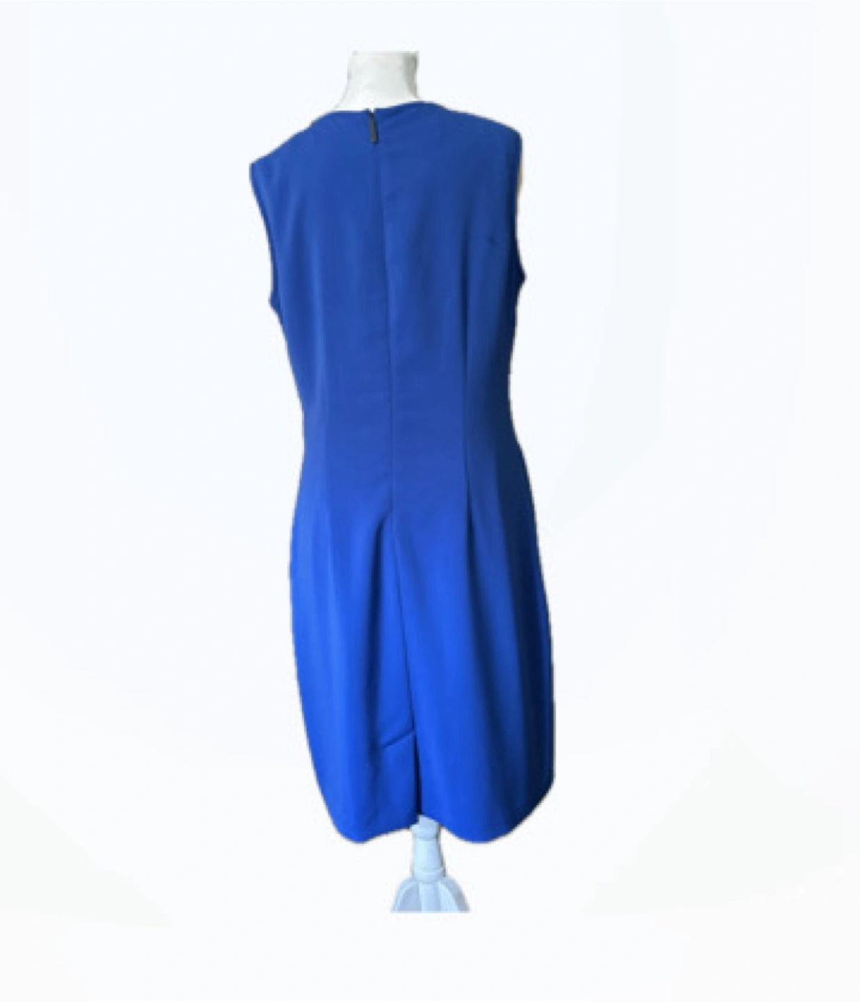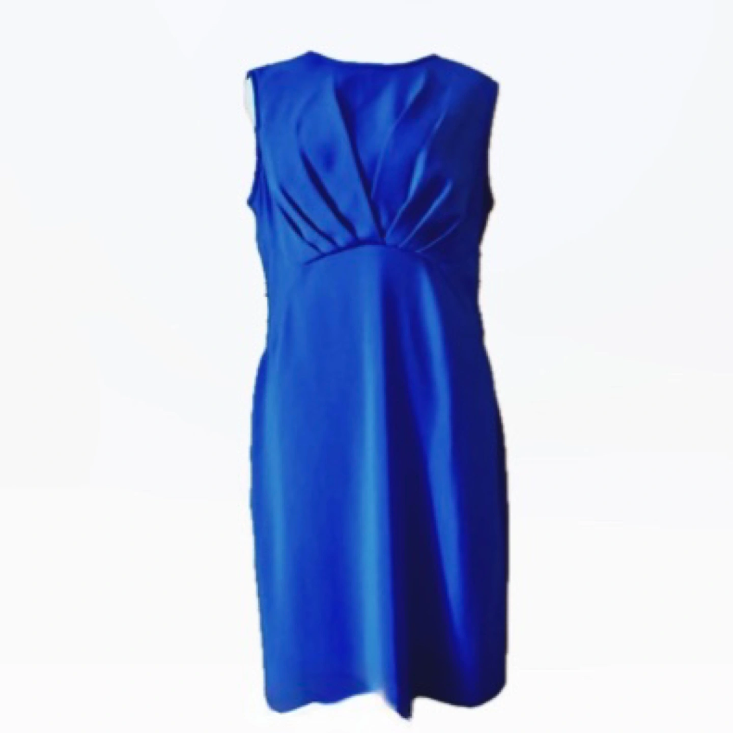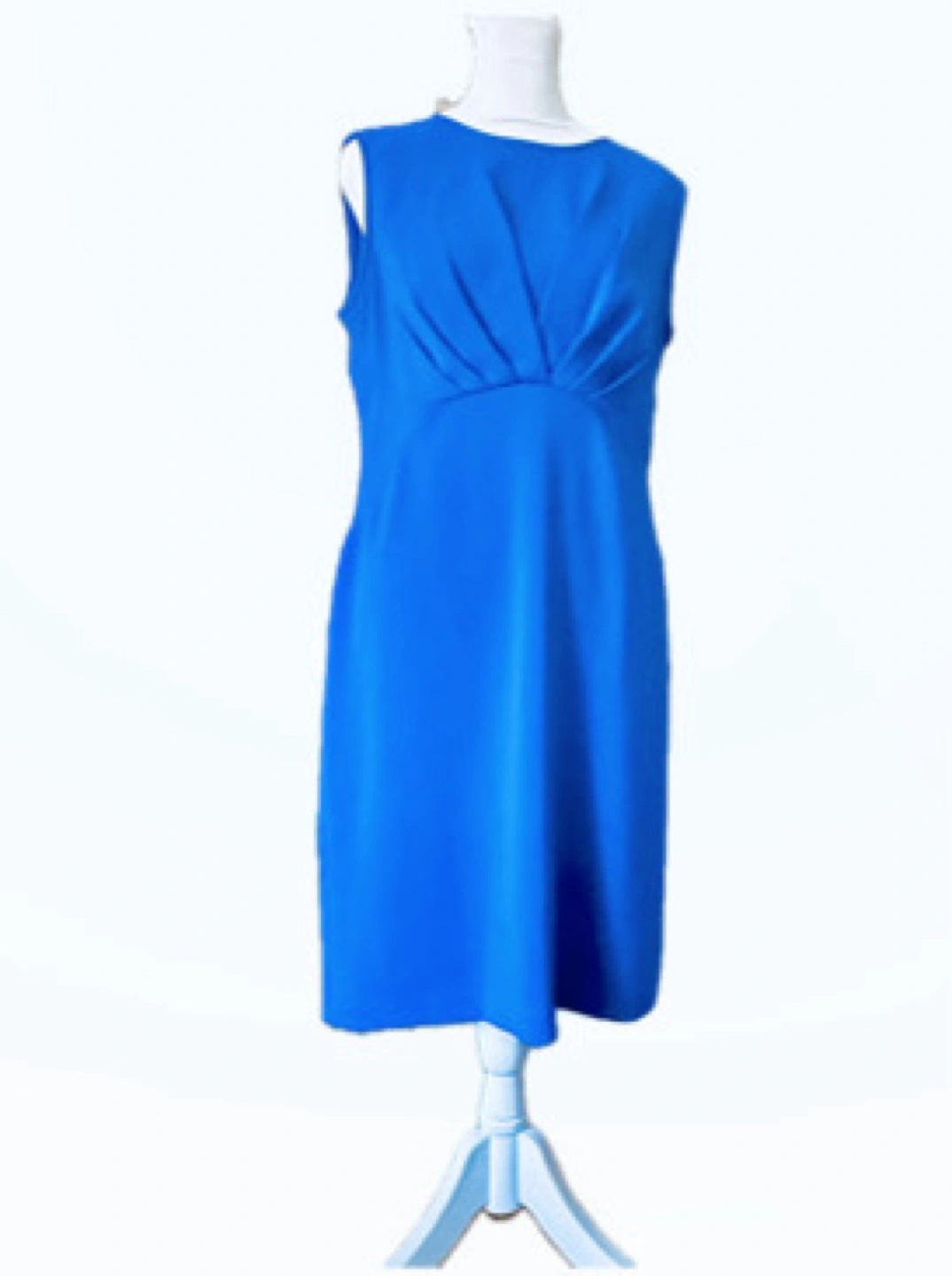Here's a lovely blue sleeveless dress! It looks to be in great condition and ready for a new home. Perfect for a party or a special occasion. Waist across is 16-17 inches with a little give. Pit to pit is 19” stretched. Hips about 20”,Length 36”. Excellent condition. Tailored well made dress.