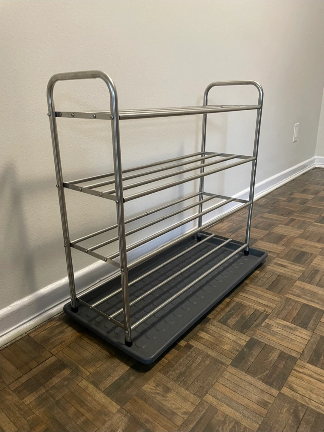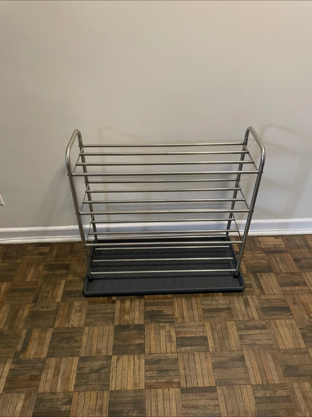Selling a shoe rack in great condition! It's a simple, sturdy design that can hold several pairs of shoes, and has a tray at the bottom to catch any dirt or water. Perfect for keeping your entryway tidy!
