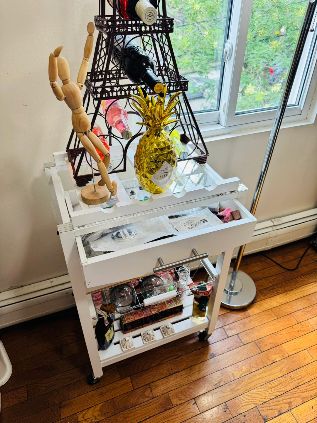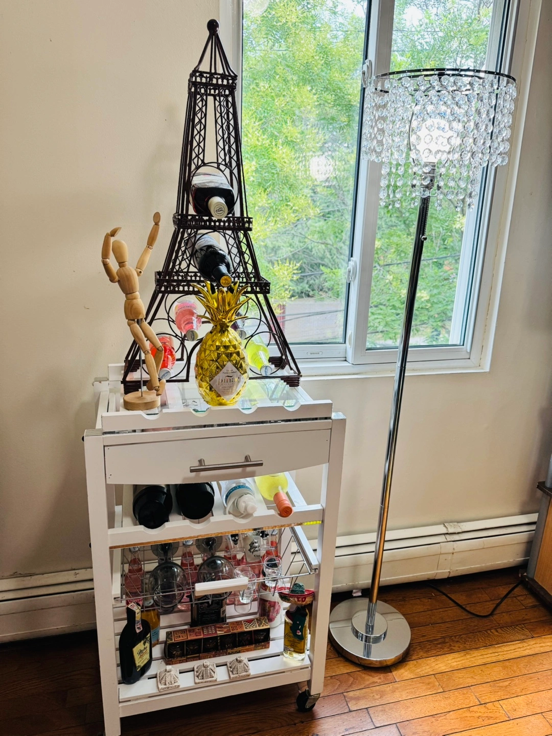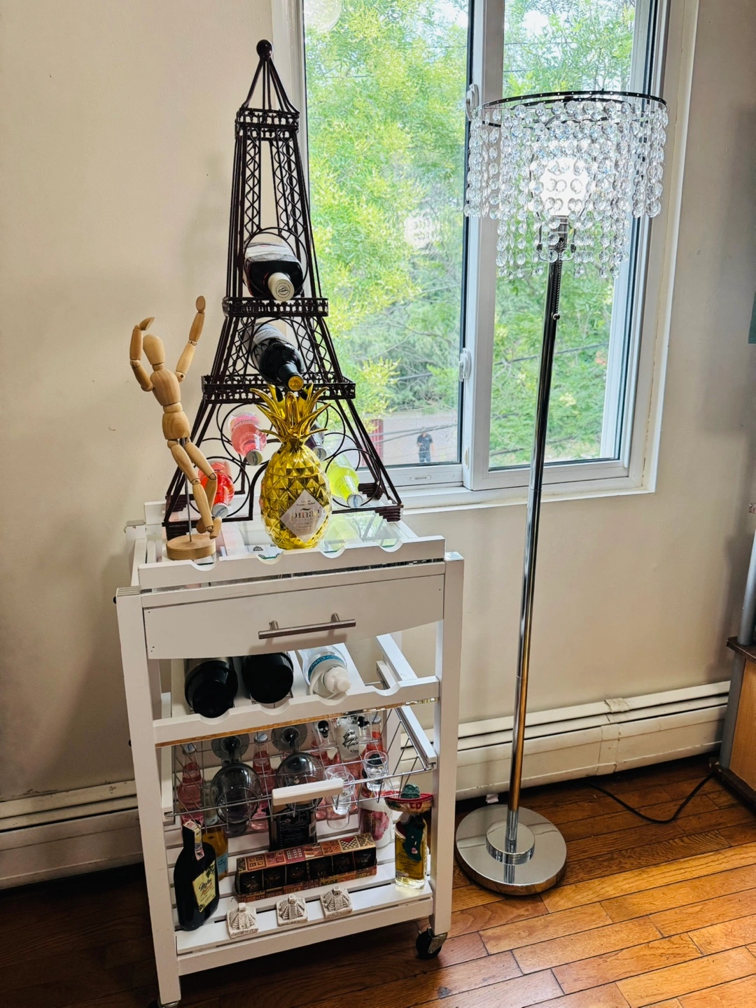 Selling a cute bar cart! It comes with a fun Eiffel Tower wine rack. Perfect for adding a touch of Parisian flair to your home bar or entertainment area It's perfect for storing your favorite drinks and glassware. The cart features a drawer and shelves for ample storage, and the rolling wheels make it easy to move around your space. Easy to transport. Pet-free home. Ready for pickup from Jamaica Hills 11432.