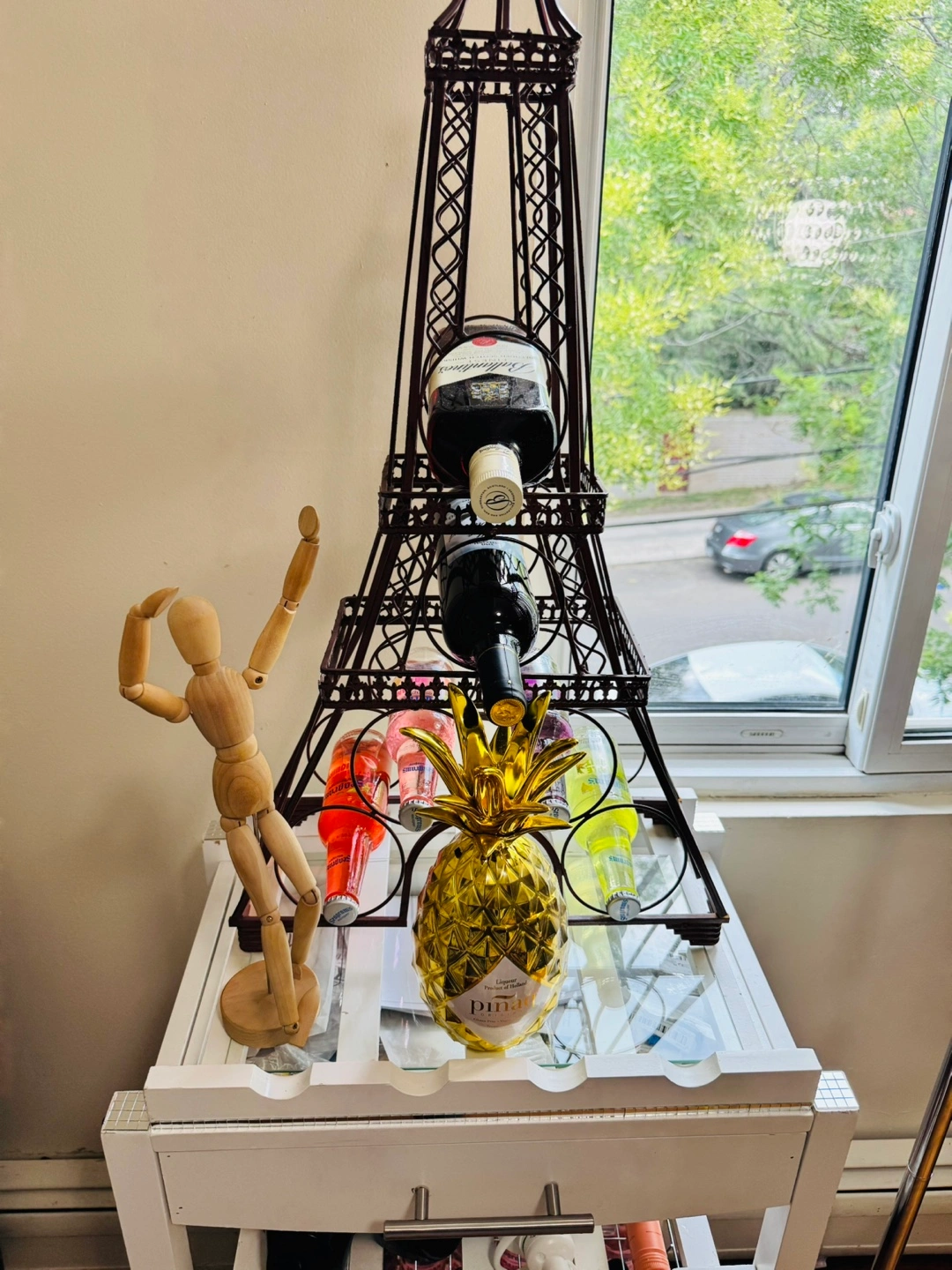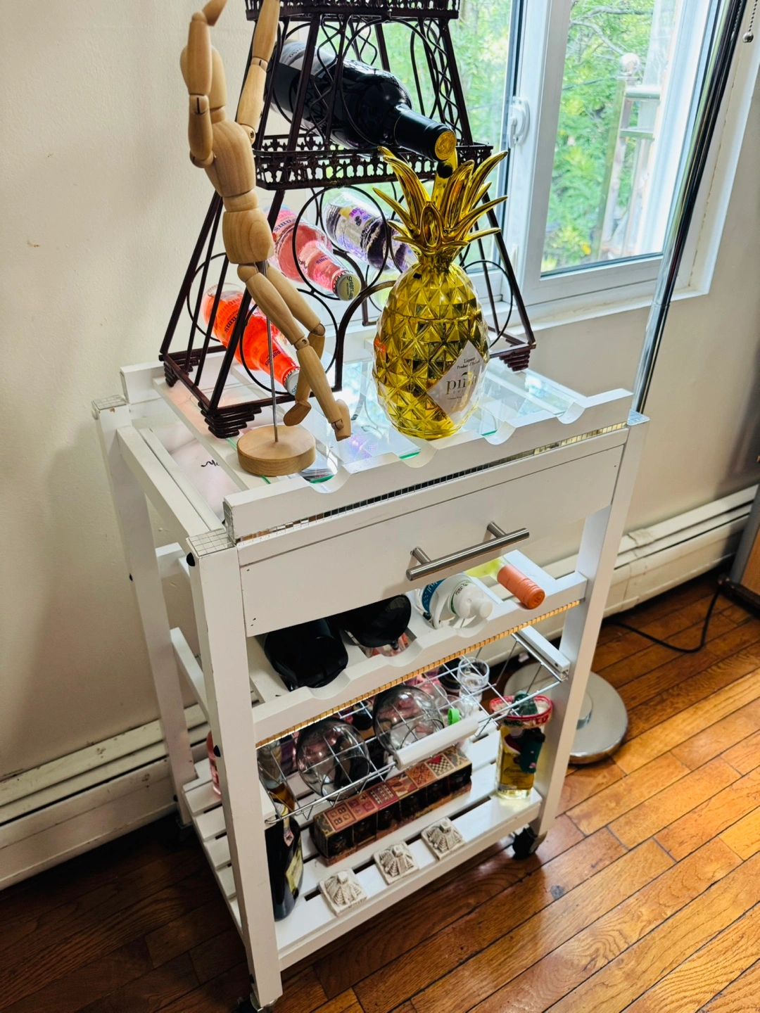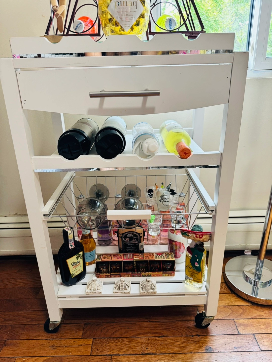 Selling a cute bar cart! It comes with a fun Eiffel Tower wine rack. Perfect for adding a touch of Parisian flair to your home bar or entertainment area It's perfect for storing your favorite drinks and glassware. The cart features a drawer and shelves for ample storage, and the rolling wheels make it easy to move around your space. Easy to transport. Pet-free home. Ready for pickup from Jamaica Hills 11432.