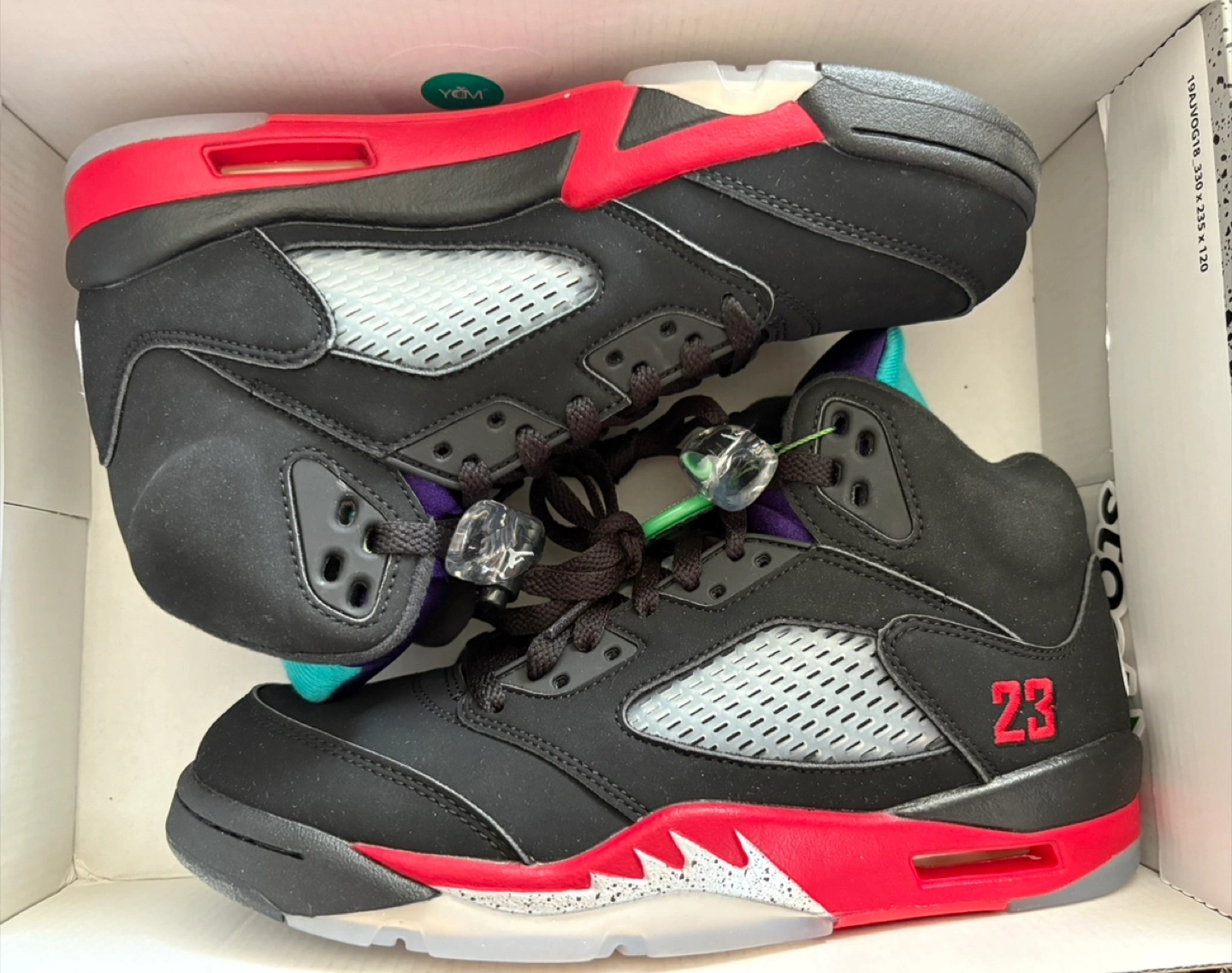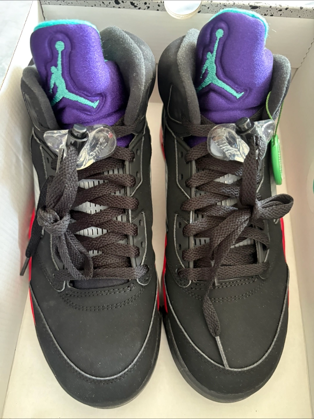 Selling a pair of Nike Air Jordan 5 Retro sneakers in the Black/Emerald-Fire Red colorway. These are a US size 7.5. New with the original box.