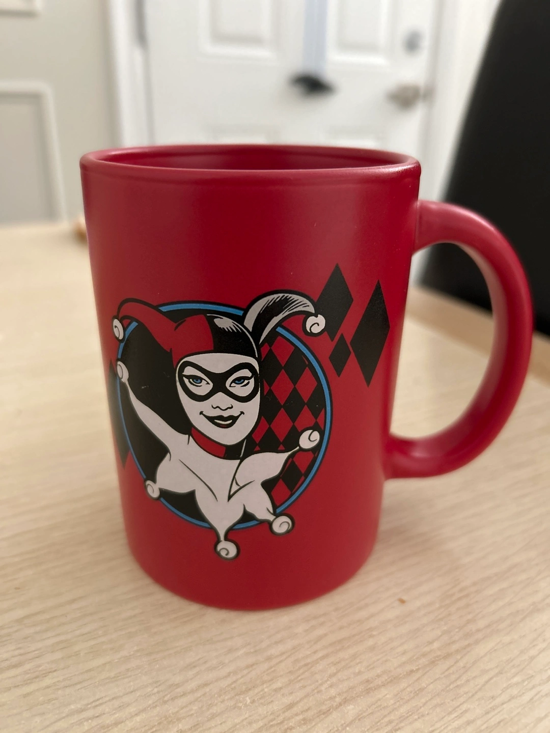 Selling a fun Harley Quinn ceramic mug! It's red and features Harley Quinn on one side and her mallet on the other. Great for any DC Comics fan!