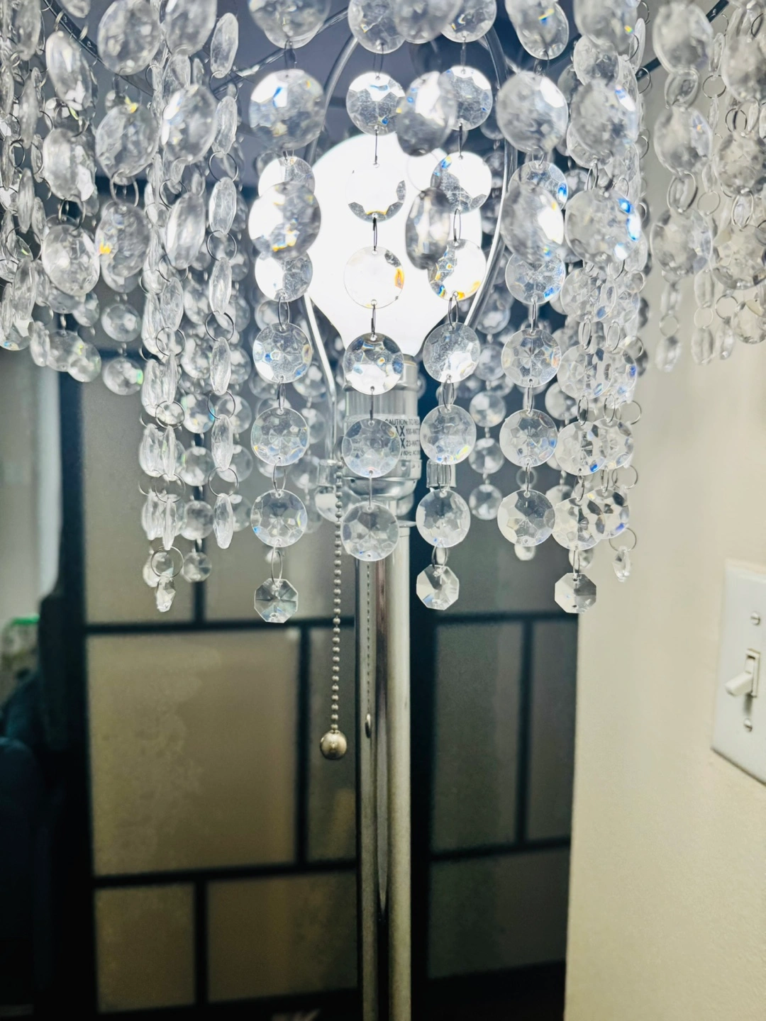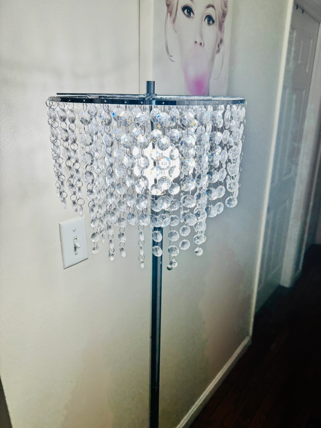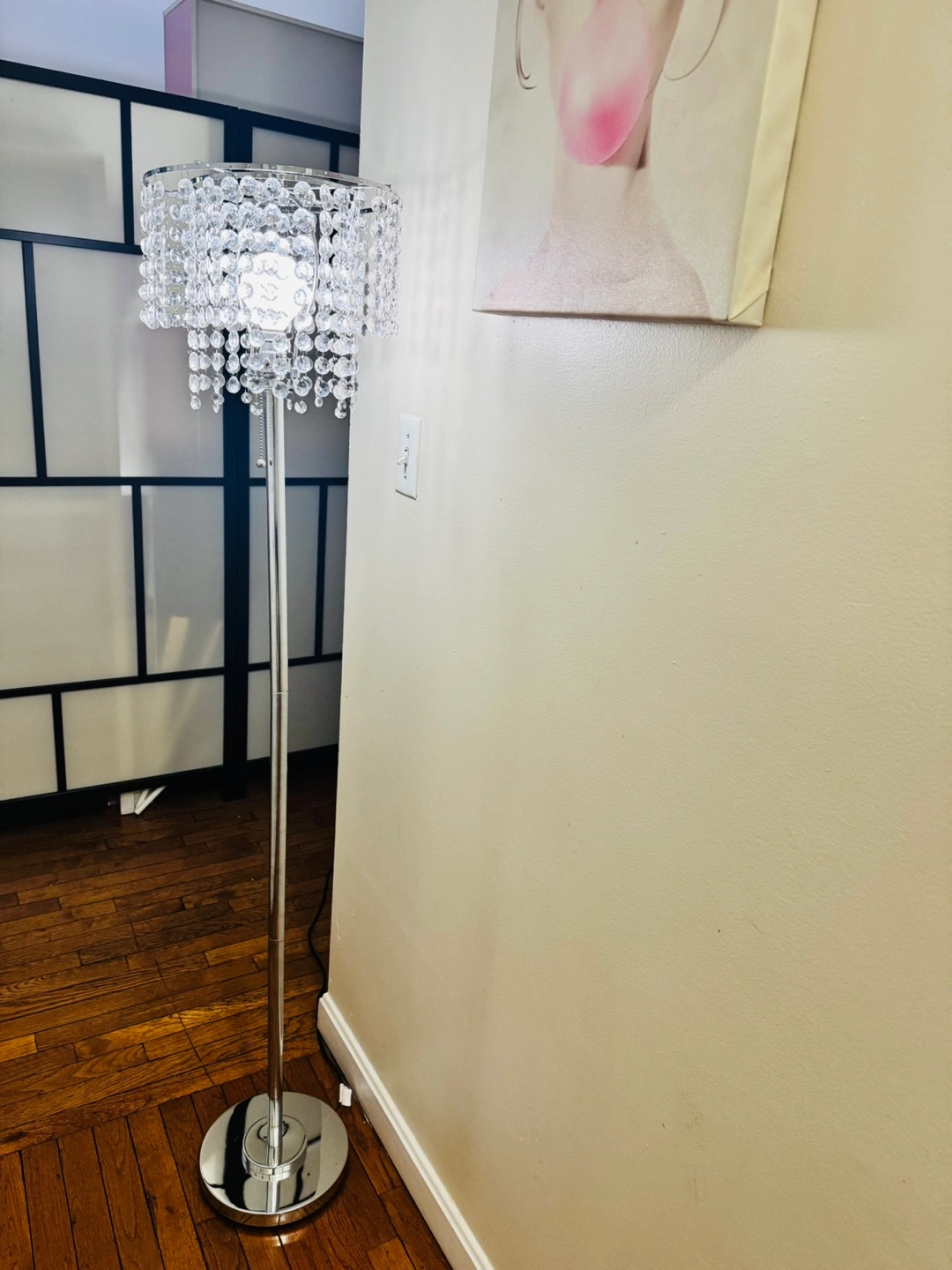 Add a touch of elegance to any room with this chandelier-style floor lamp! It features a silver-tone finish and cascading faux crystals that create a beautiful, shimmering effect. This lamp is perfect for living rooms, bedrooms, or any space where you want to add a bit of glamour. Easy to transport. Pet-free home. Ready for pickup from Jamaica Hills 11432.