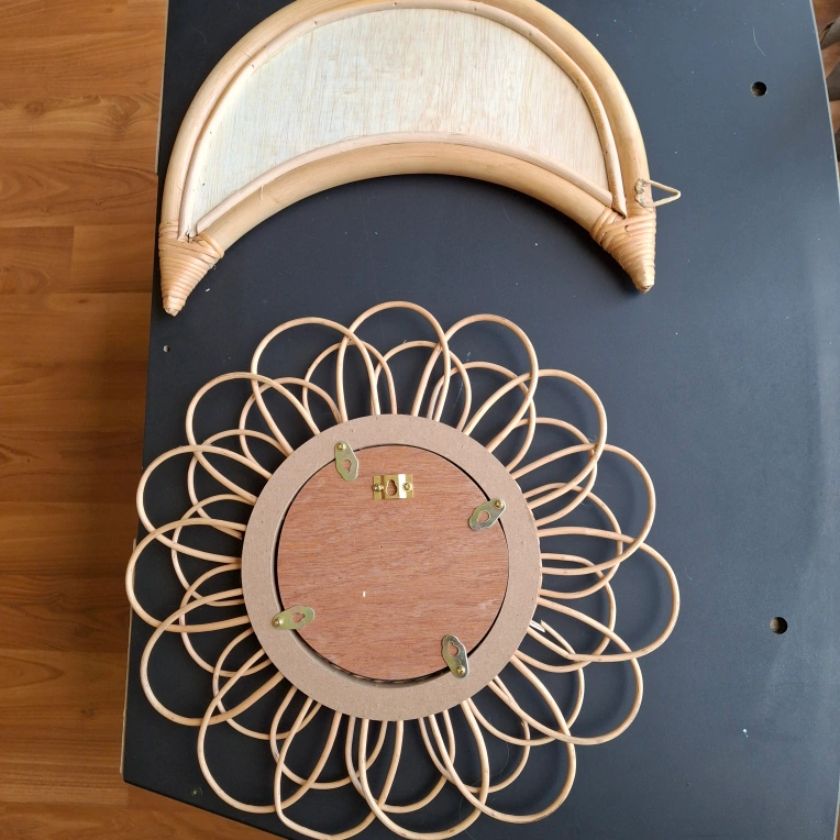 Selling a set of two rattan mirrors! One is a cute flower shape and the other is a half moon shape. There are some signs of wear on the rattan, as pictured.