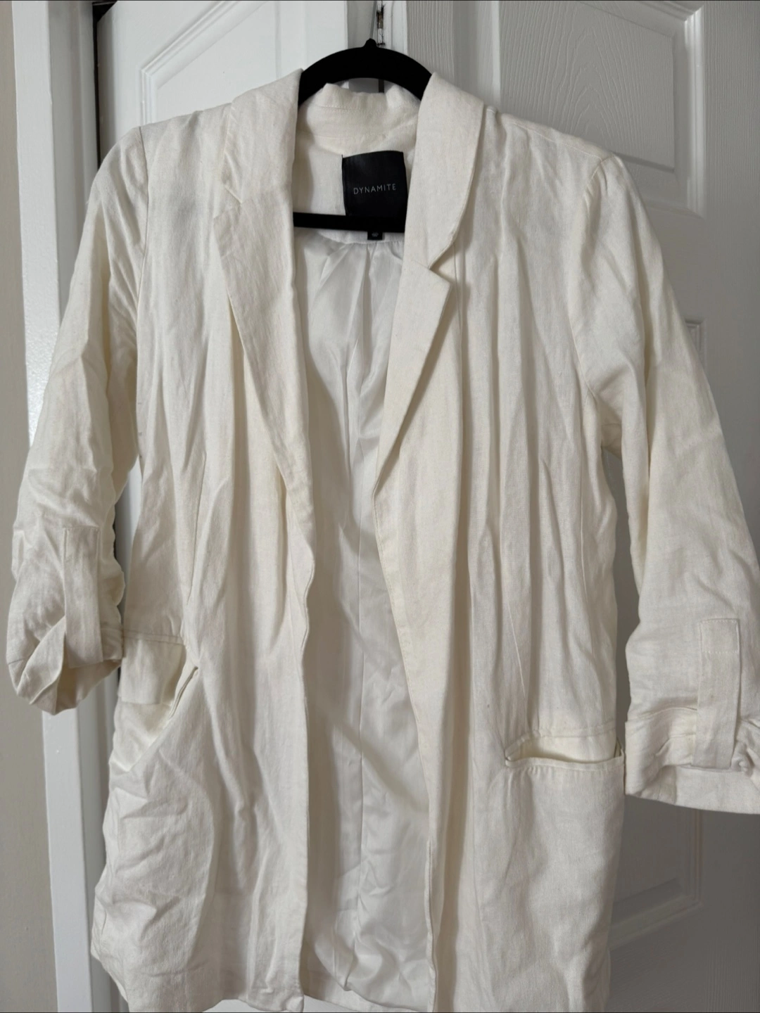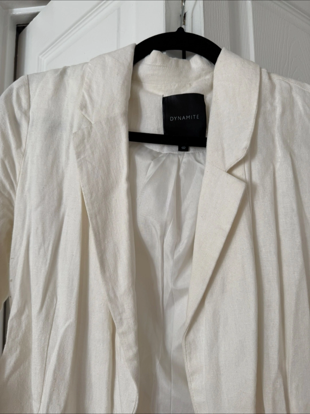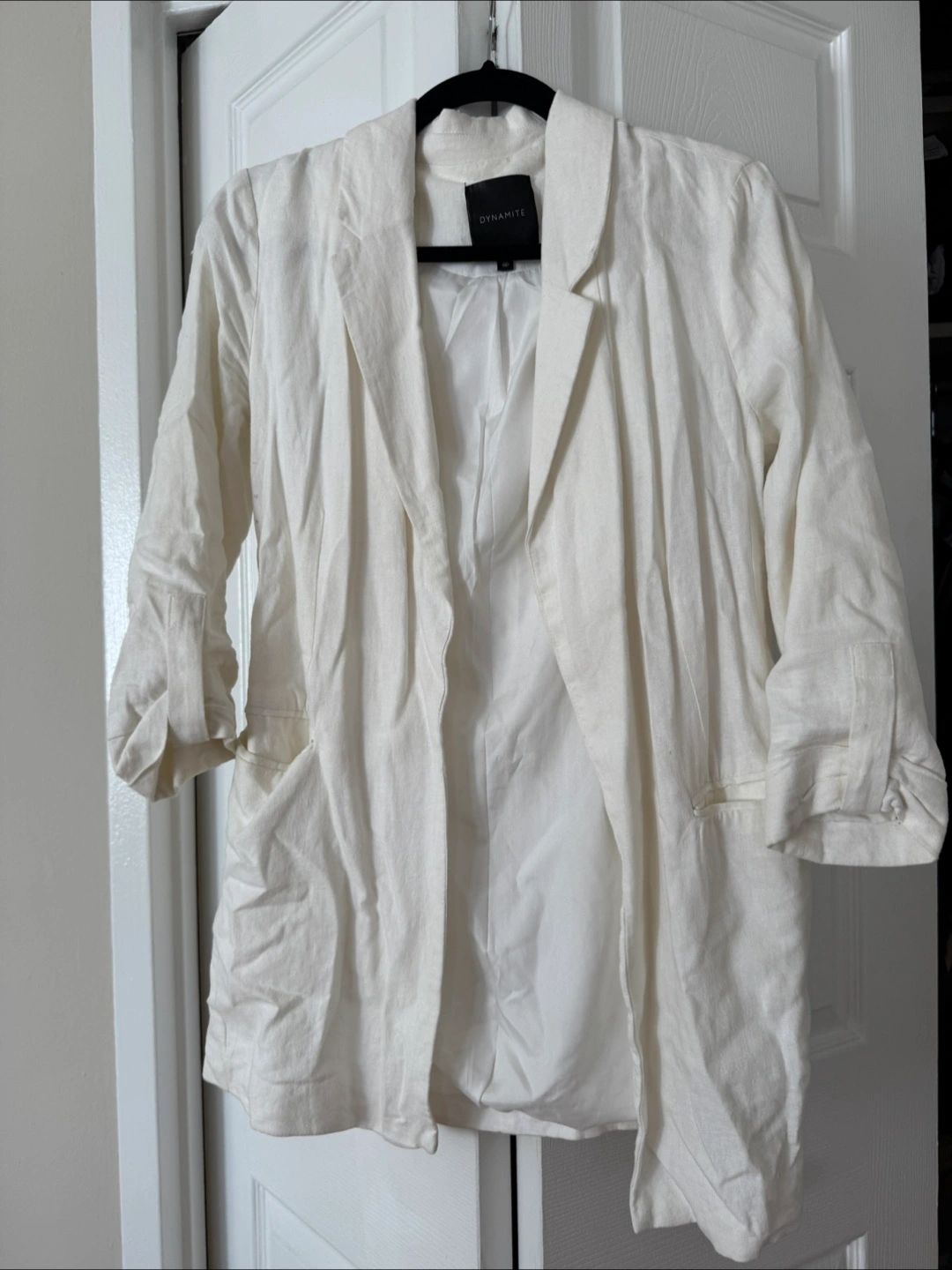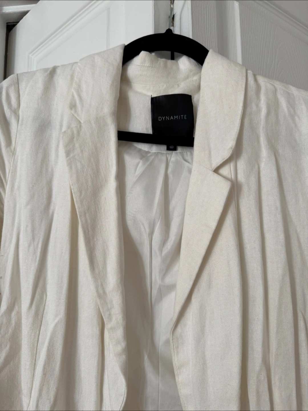 Selling a Dynamite blazer in a lovely white colour! It's a size S and would be a great addition to your wardrobe for a chic, professional look