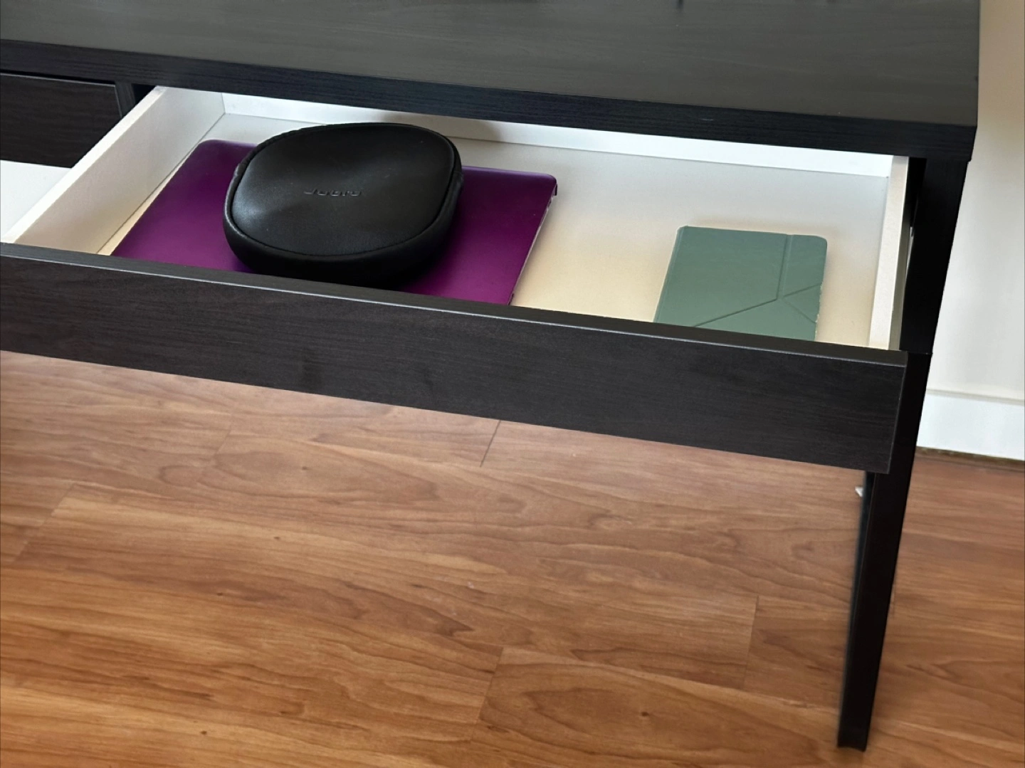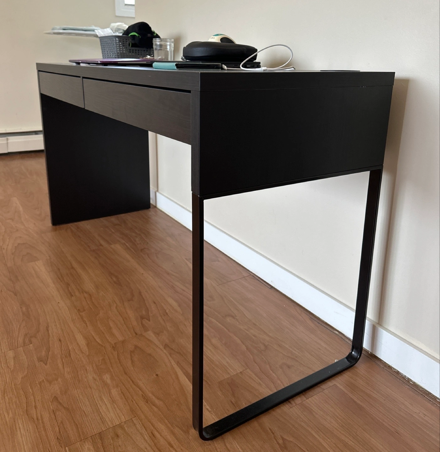 Dark brown IKEA Micke desk. Clean and simple design. Perfect for any workspace or student studio. The desk has 2 drawers for storage, and a cable outlet to keep your cords organized. It's in good condition and ready for a new home! Original IKEA manual is available.