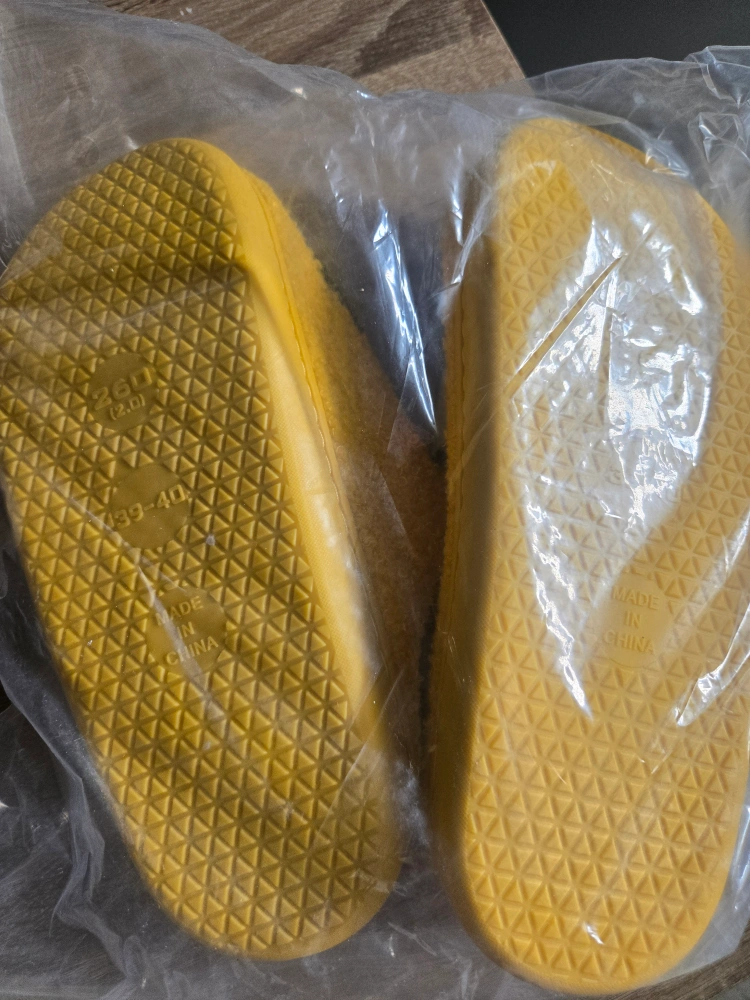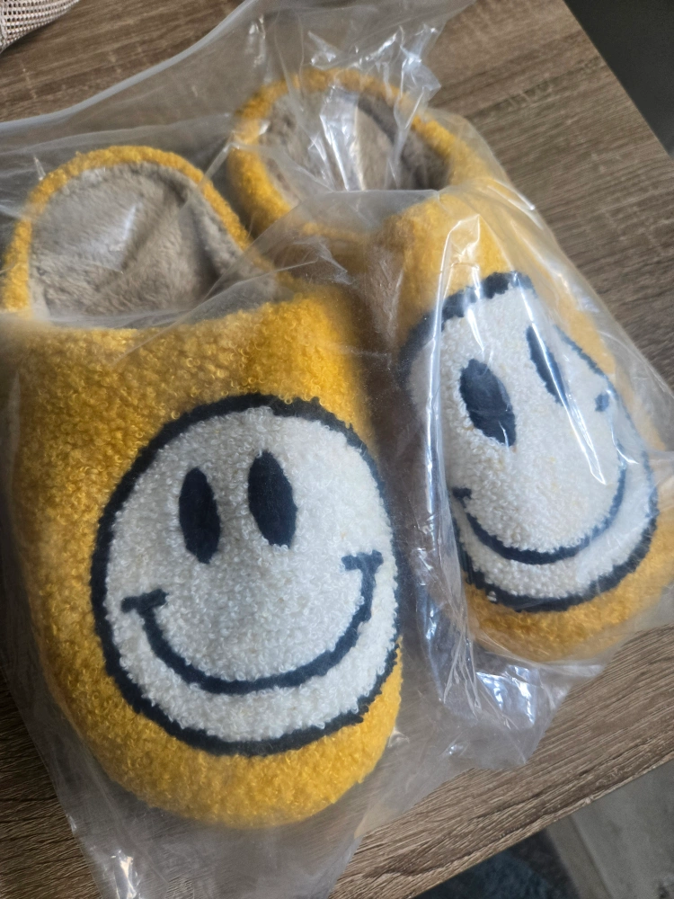 Selling a pair of cute yellow slippers with a smiley face design! They are size 39-40, which is approximately a US size 8.5-9 for women. Perfect for keeping your feet cozy and adding a bit of fun to your loungewear