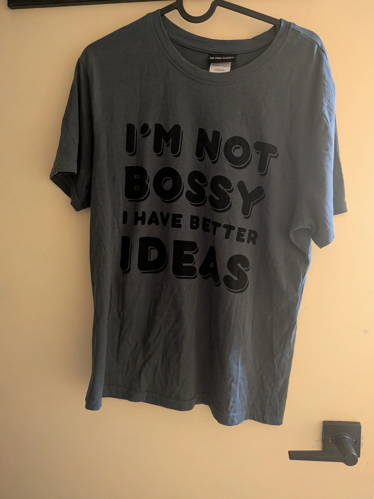 118Selling a t-shirt from The Pink Closet in size medium. It has a funny saying and it's gray . Made of 60% cotton and 40% polyester. Barely worn.