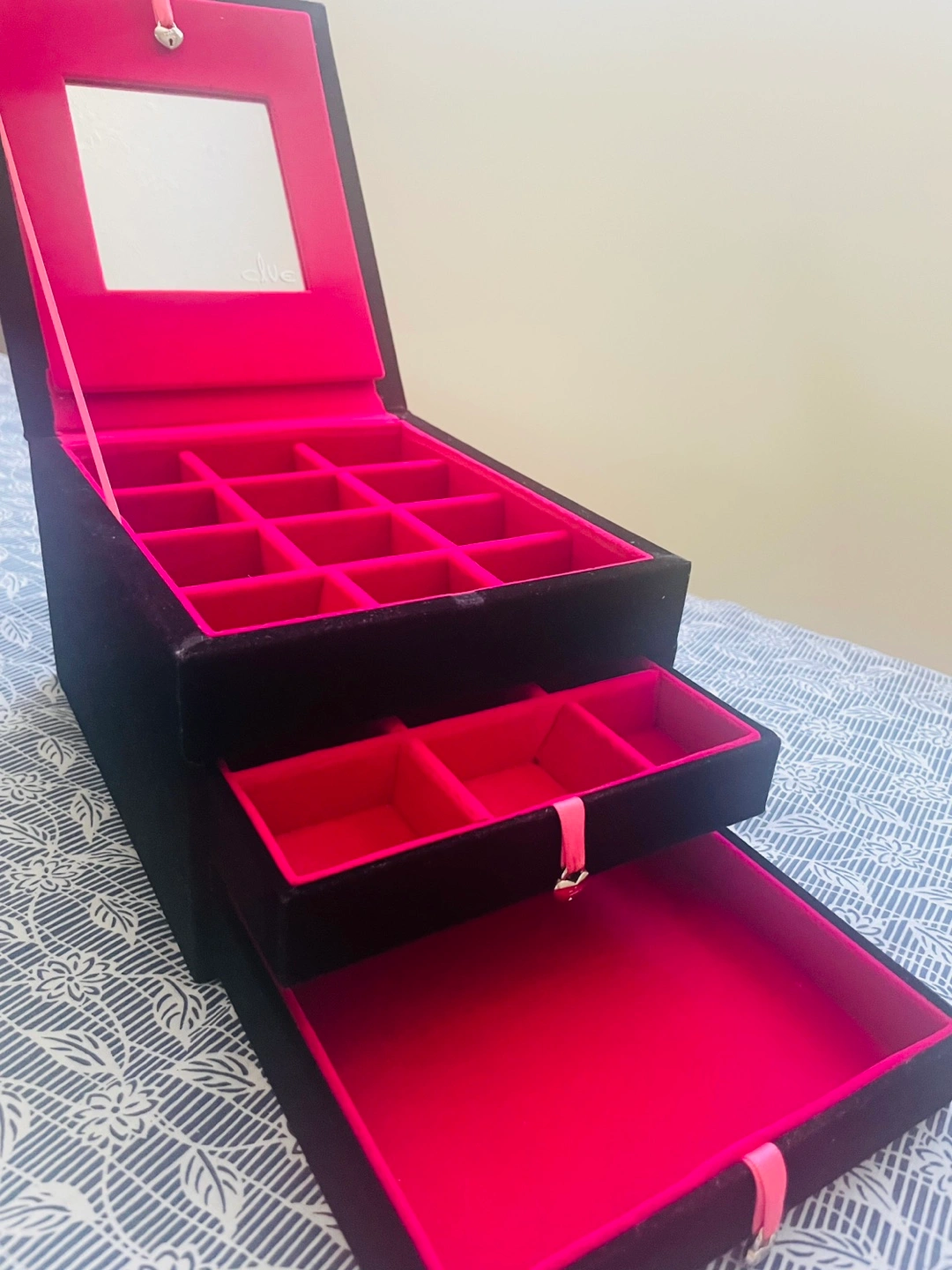 Selling a lovely velvet jewelry box from Clue! It's a stylish way to keep your jewelry organized with its black exterior and vibrant pink interior. It features multiple compartments and a mirror.