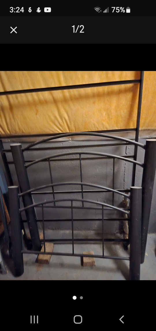 Selling a metal bed frame in good condition.It has a head board, foot board, and slat.It's sturdy and ready for a new home!