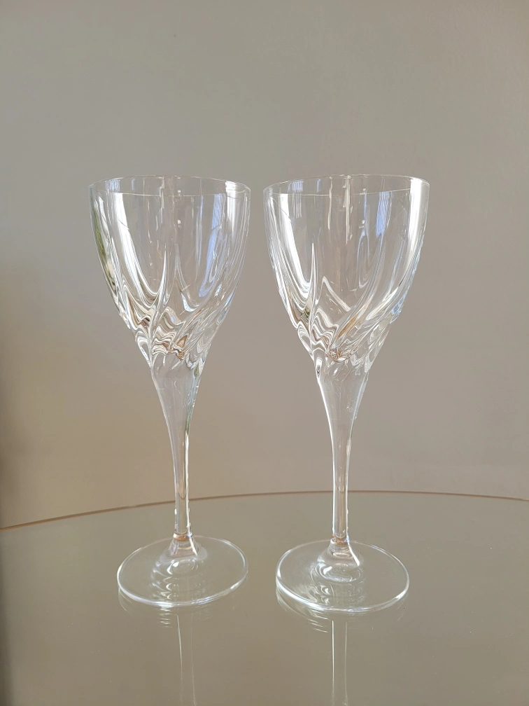 Two beautiful wine glasses. Unique swirling design. Perfect for a special occasion or everyday use. Clear and elegant.