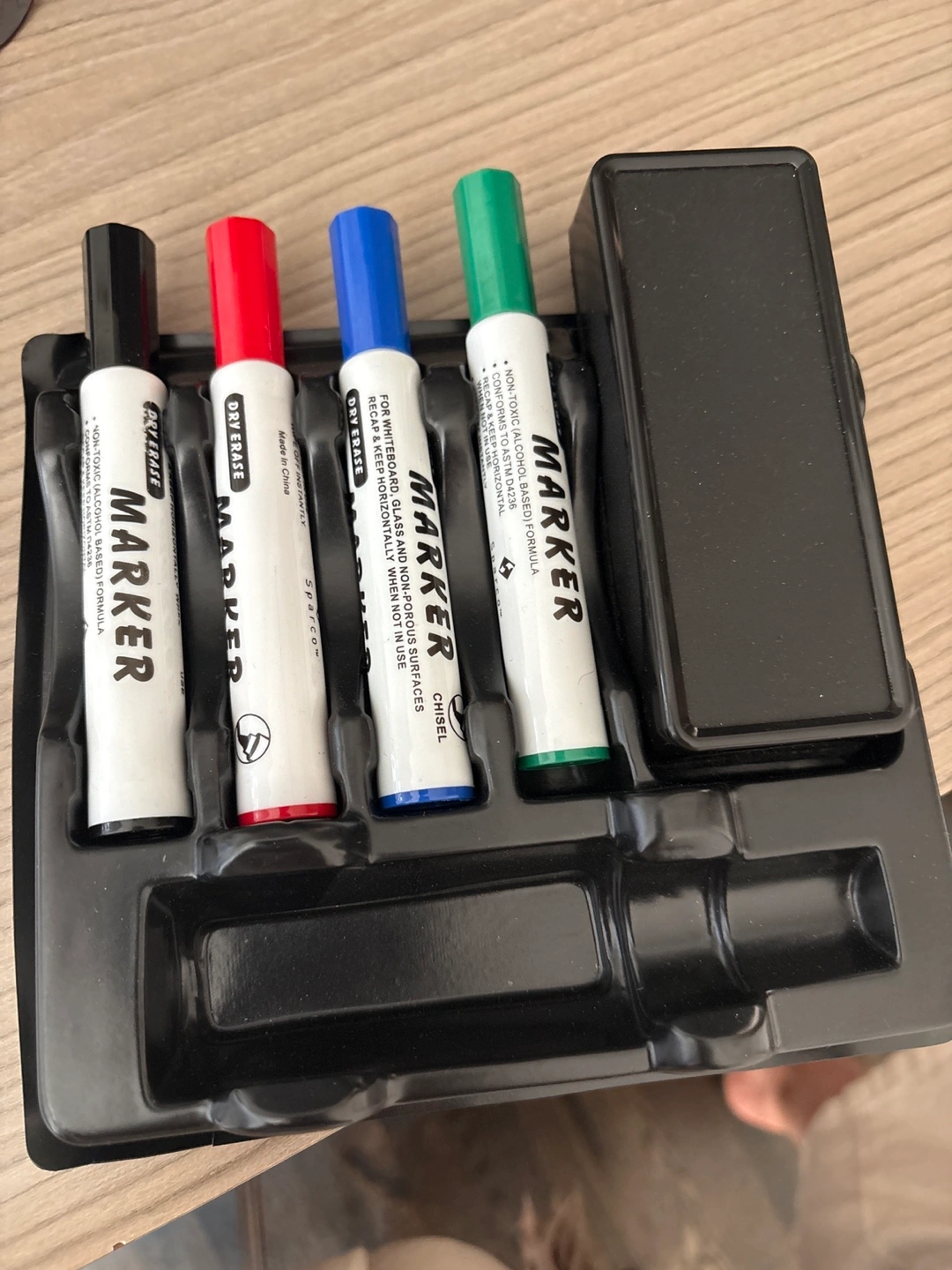 Here's a set of Sparco dry erase markers! This set includes black, red, blue, and green markers and eraser. They're designed for use on whiteboards, glass, and other non-porous surfaces. Just recap and keep them horizontal when you're not using them