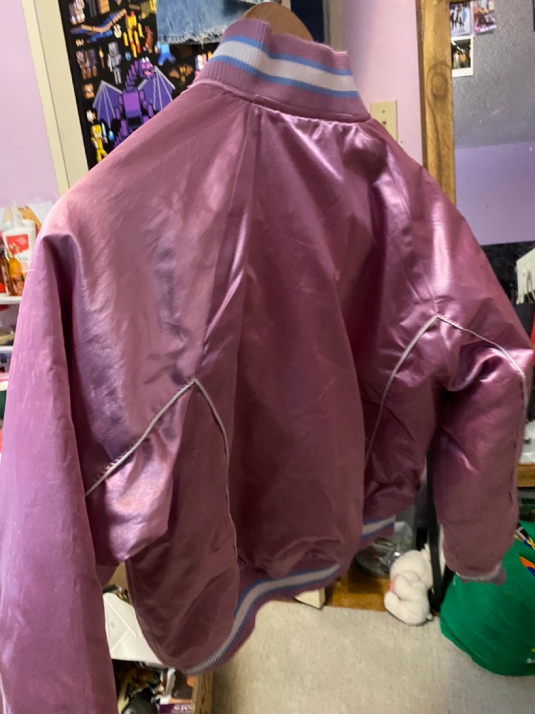 Selling a cute Atlanta satin bomber jacket! It's a lovely lilac colour with white and blue striped detailing on the collar, cuffs, and hem. Perfected for adding a pop of colour to your wardrobe!