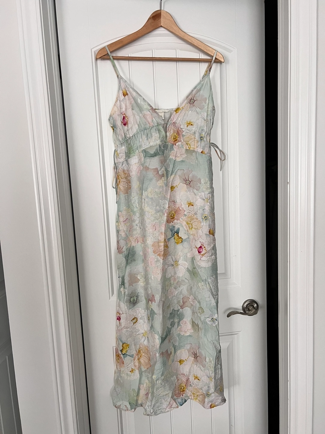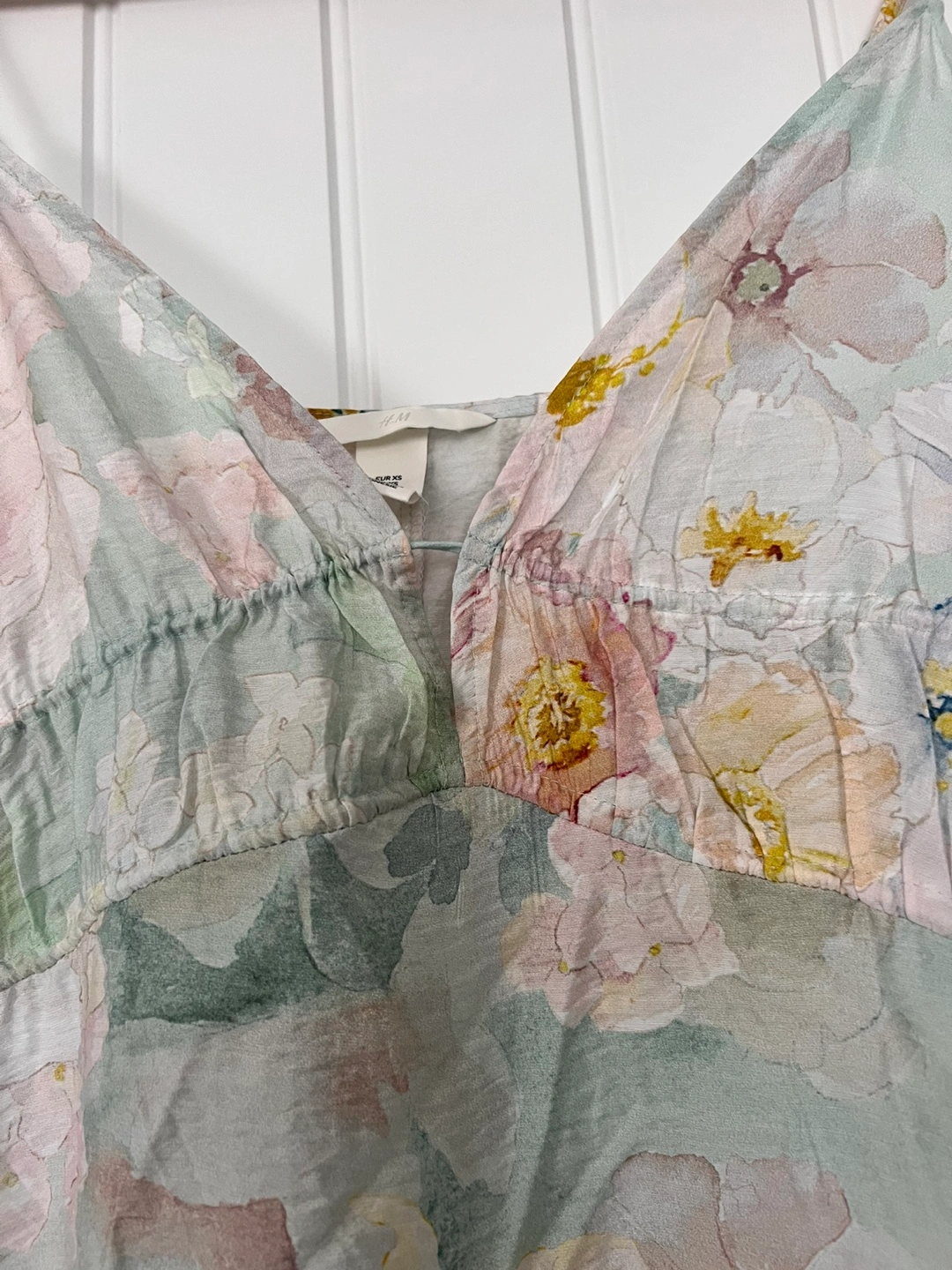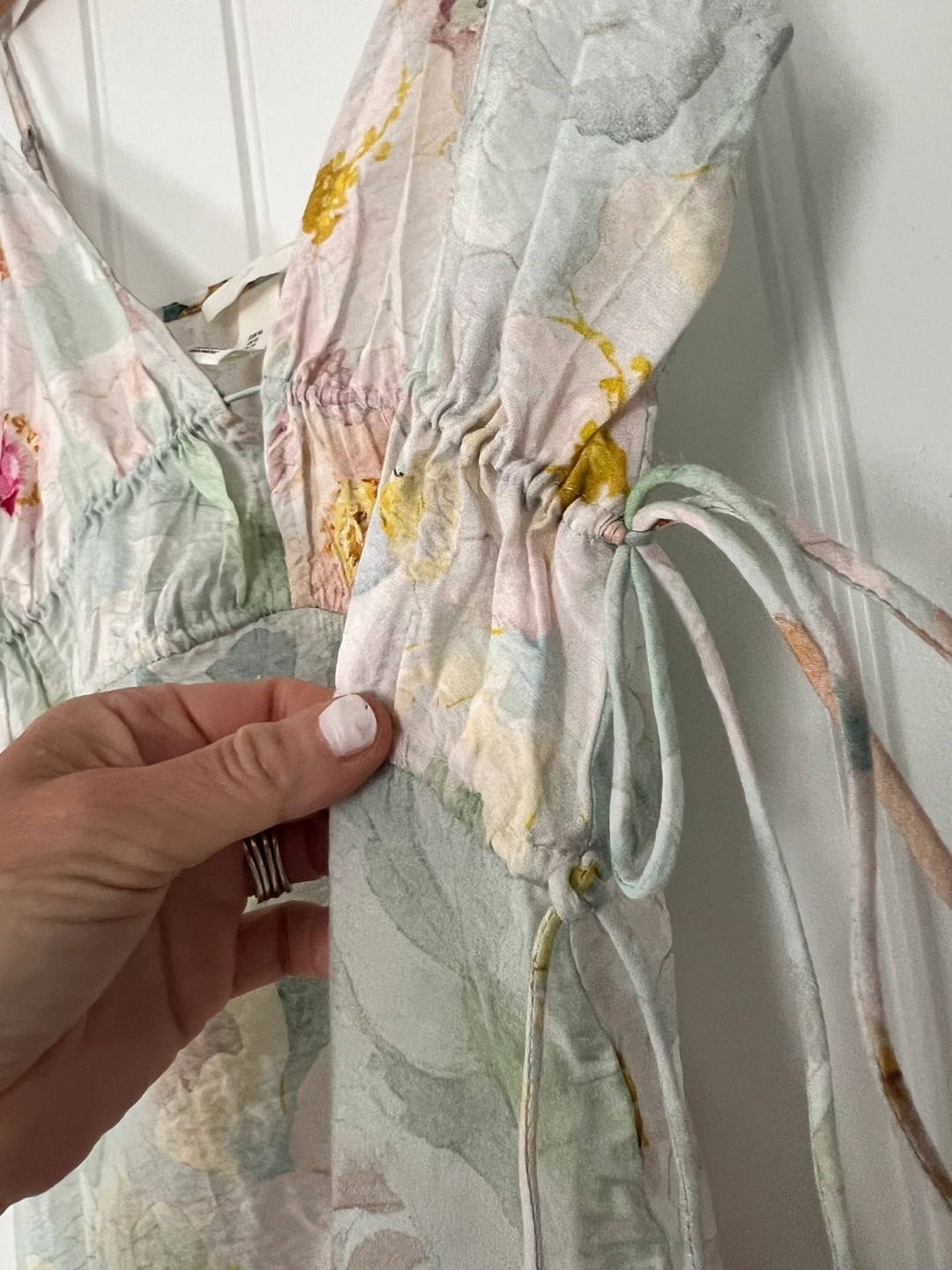 This is a beautiful floral print summery dress. Barely worn and in perfect condition. Size is xs but because of the adjustable strings at either side it can fit up to a medium.