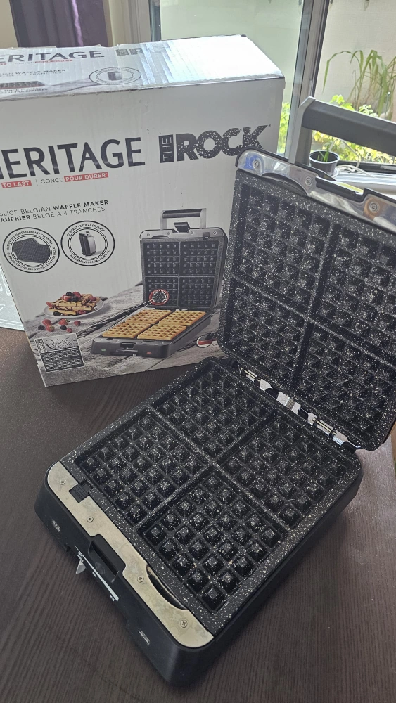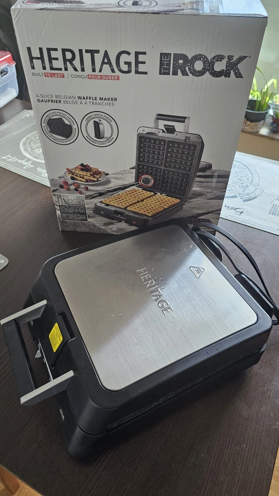 Selling a Heritage The Rock 4-slice Belgian waffle maker! It's in great shape and ready to make some delicious waffles. It has a non-stick surface, so cleanup is a breeze. Originally bought for $179.99. Comes with the box!