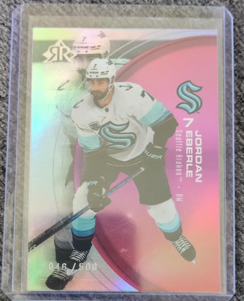 Selling a Jordan Eberle hockey card featuring him with the Seattle Kraken! It's from the SP Reflections series and numbered 046/500